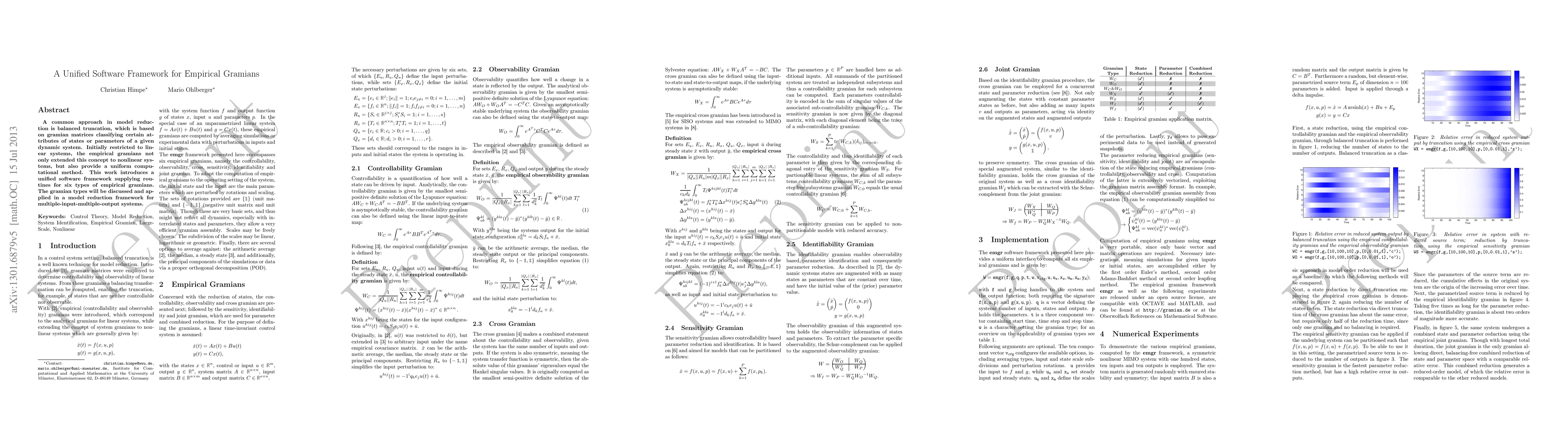 A common approach in model reduction is balanced truncation, which is based on gramian matrices classifiying certain attributes of states or parameters of a given dynamic system. Initially restricted to linear systems, the empirical gramians not only extended this concept to nonlinear systems, but also provide a uniform computational method. This work introduces a unified software framework supplying routines for six types of empirical gramians. The gramian types will be discussed and applied in a model reduction framework for multiple-input-multiple-output (MIMO) systems.