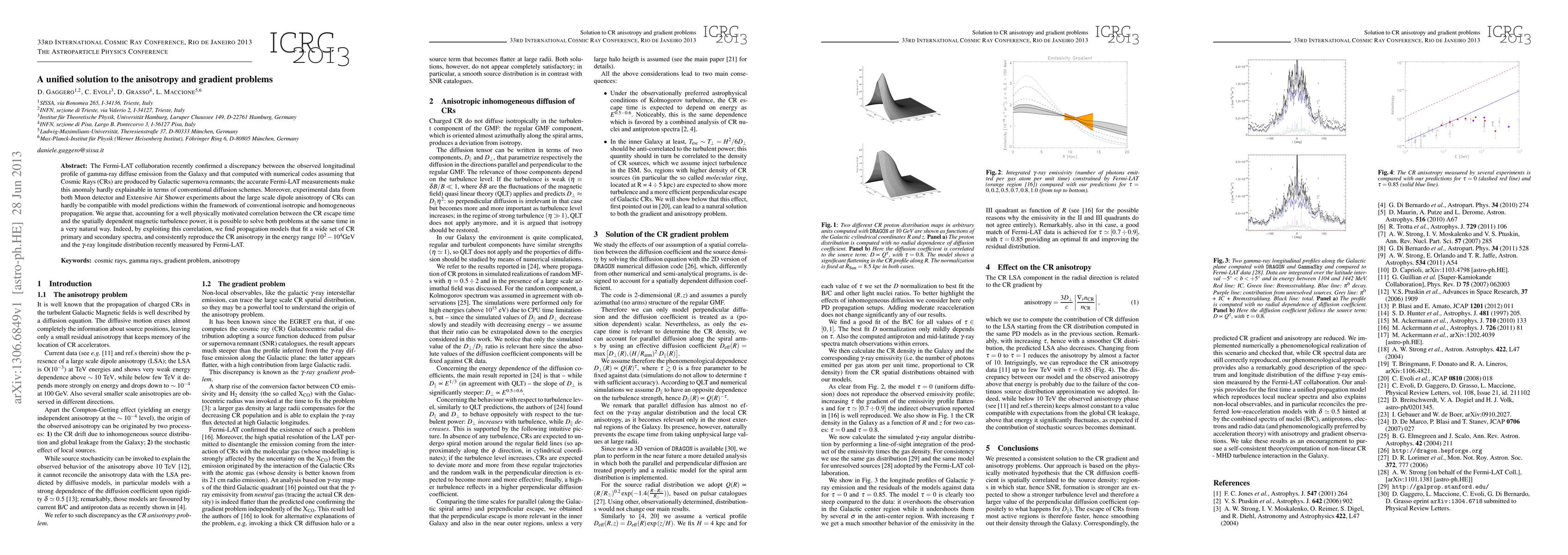 The Fermi-LAT collaboration recently confirmed a discrepancy between the observed longitudinal profile of gamma-ray diffuse emission from the Galaxy and that computed with numerical codes assuming that Cosmic Rays (CRs) are produced by Galactic supernova remnants; the accurate Fermi-LAT measurements make this anomaly hardly explainable in terms of conventional diffusion schemes. Moreover, experimental data from both Muon detector and Extensive Air Shower experiments about the large scale dipole anisotropy of CRs can hardly be compatible with model predictions within the framework of conventional isotropic and homogeneous propagation. We argue that, accounting for a well physically motivated correlation between the CR escape time and the spatially dependent magnetic turbulence power, it is possible to solve both problems at the same time in a very natural way. Indeed, by exploiting this correlation, we find propagation models that fit a wide set of CR primary and secondary spectra, and consistently reproduce the CR anisotropy in the energy range 100 GeV - 10 TeV and the gamma-ray longitude distribution recently measured by Fermi-LAT.