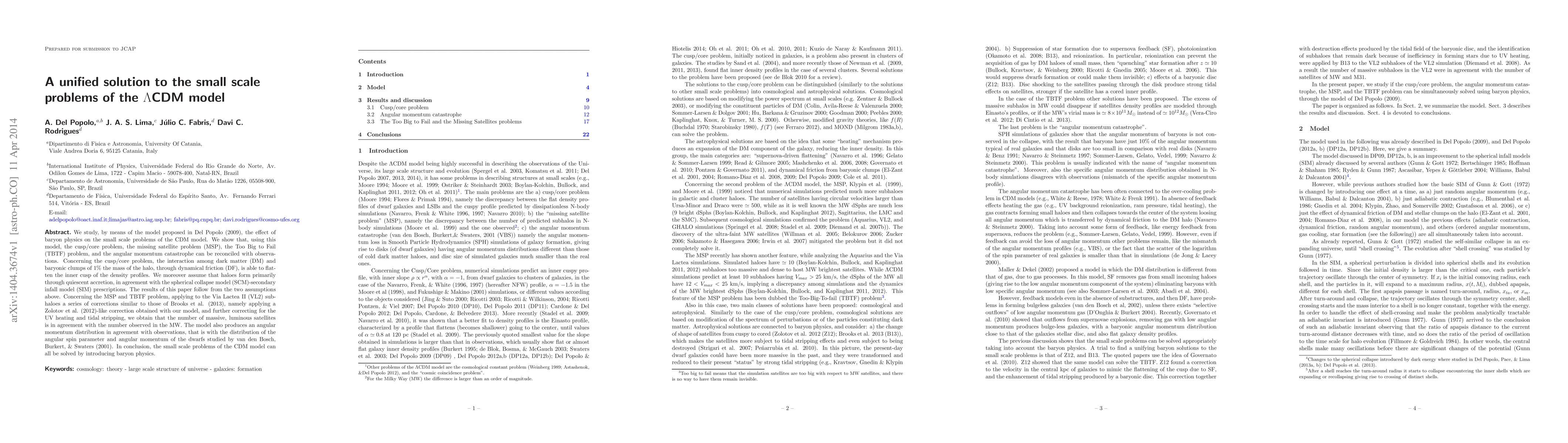 We study, by means of the model proposed in Del Popolo (2009), the effect of baryon physics on the small scale problems of the CDM model. We show that, using this model, the cusp/core problem, the missing satellite problem (MSP), the Too Big to Fail (TBTF) problem, and the angular momentum catastrophe can be reconciled with observations. Concerning the cusp/core problem, the interaction among dark matter (DM) and baryonic clumps of 1% the mass of the halo, through dynamical friction (DF), is able to flatten the inner cusp of the density profiles. We moreover assume that haloes form primarily through quiescent accretion, in agreement with the spherical collapse model (SCM)-secondary infall model (SIM) prescriptions. The results of this paper follow from the two assumptions above. Concerning the MSP and TBTF problem, applying to the Via Lactea II (VL2) subhaloes a series of corrections similar to those of Brooks et al. (2013), namely applying a Zolotov et al. (2012)-like correction obtained with our model, and further correcting for the UV heating and tidal stripping, we obtain that the number of massive, luminous satellites is in agreement with the number observed in the MW. The model also produces an angular momentum distribution in agreement with observations, that is with the distribution of the angular spin parameter and angular momentum of the dwarfs studied by van den Bosch, Burkert, & Swaters (2001). In conclusion, the small scale problems of the CDM model can all be solved by introducing baryon physics.
