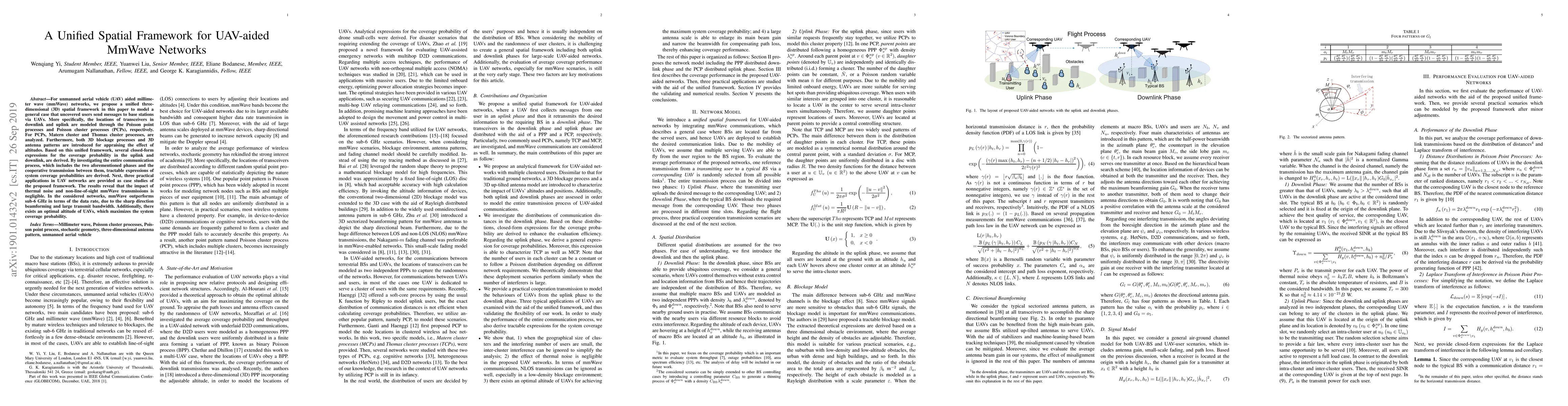 The paper introduces a unified spatial framework for UAV networks, providing closed-form expressions for coverage probabilities in both uplink and downlink phases, and analyzing the impact of altitude, blockage, and noise.