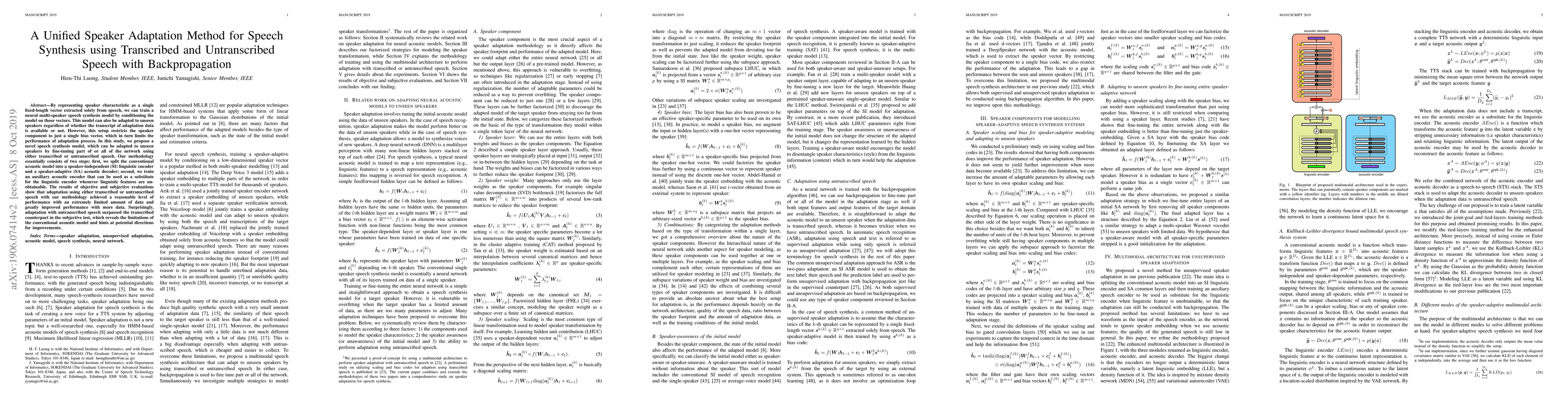 By representing speaker characteristic as a single fixed-length vector extracted solely from speech, we can train a neural multi-speaker speech synthesis model by conditioning the model on those vectors. This model can also be adapted to unseen speakers regardless of whether the transcript of adaptation data is available or not. However, this setup restricts the speaker component to just a single bias vector, which in turn limits the performance of adaptation process. In this study, we propose a novel speech synthesis model, which can be adapted to unseen speakers by fine-tuning part of or all of the network using either transcribed or untranscribed speech. Our methodology essentially consists of two steps: first, we split the conventional acoustic model into a speaker-independent (SI) linguistic encoder and a speaker-adaptive (SA) acoustic decoder; second, we train an auxiliary acoustic encoder that can be used as a substitute for the linguistic encoder whenever linguistic features are unobtainable. The results of objective and subjective evaluations show that adaptation using either transcribed or untranscribed speech with our methodology achieved a reasonable level of performance with an extremely limited amount of data and greatly improved performance with more data. Surprisingly, adaptation with untranscribed speech surpassed the transcribed counterpart in the subjective test, which reveals the limitations of the conventional acoustic model and hints at potential directions for improvements.