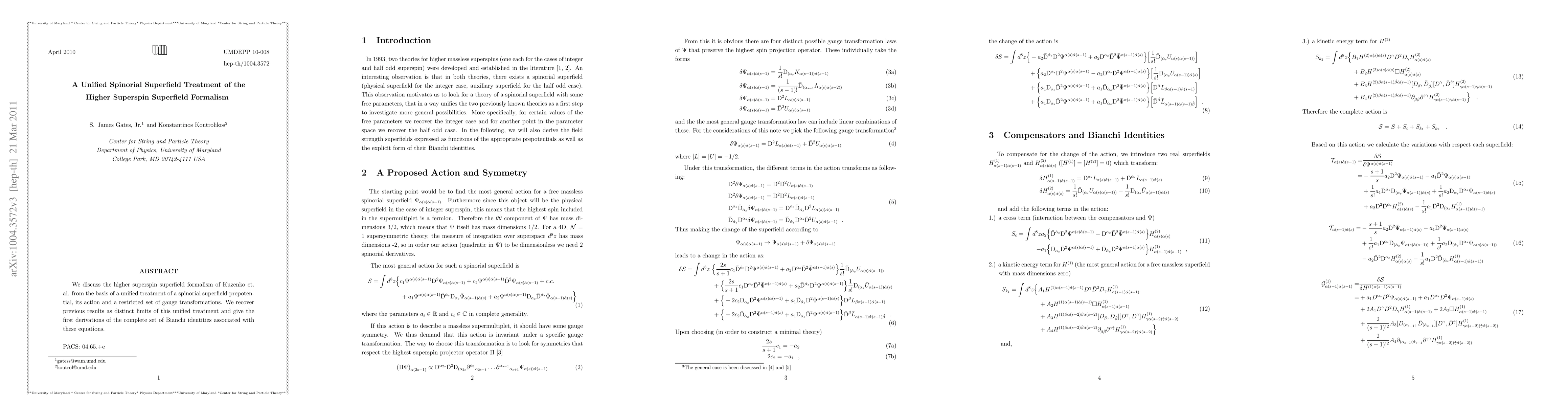 We discuss the higher superspin superfield formalism of Kuzenko et al from the basis of a unified treatment of an unconstrained spinorial superfield prepotential, its action and a restricted set of gauge transformations. We recover previous results as distinct limits of this unified treatment and give the first derivations of the complete set of Bianchi identities associated with these equations.