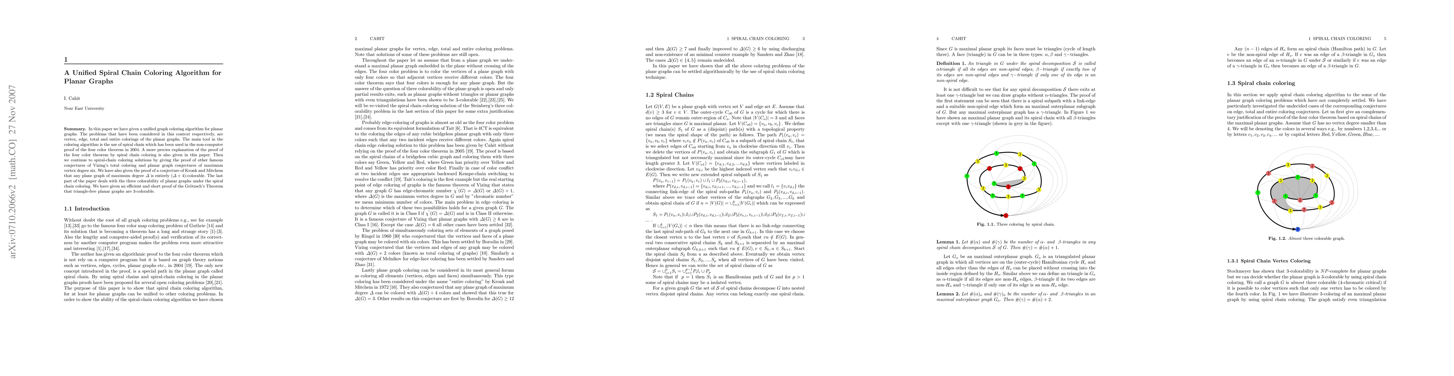 This paper presents a unified spiral chain coloring algorithm for planar graphs, addressing vertex, edge, total, and entire colorings. It leverages the spiral chain method, originally used in the non-computer proof of the four color theorem, to prove several conjectures including Vizing's total coloring theorem and the maximum vertex degree six conjecture, and provides an efficient proof of the Groetzsch's Theorem on the three colorability of triangle-free planar graphs.