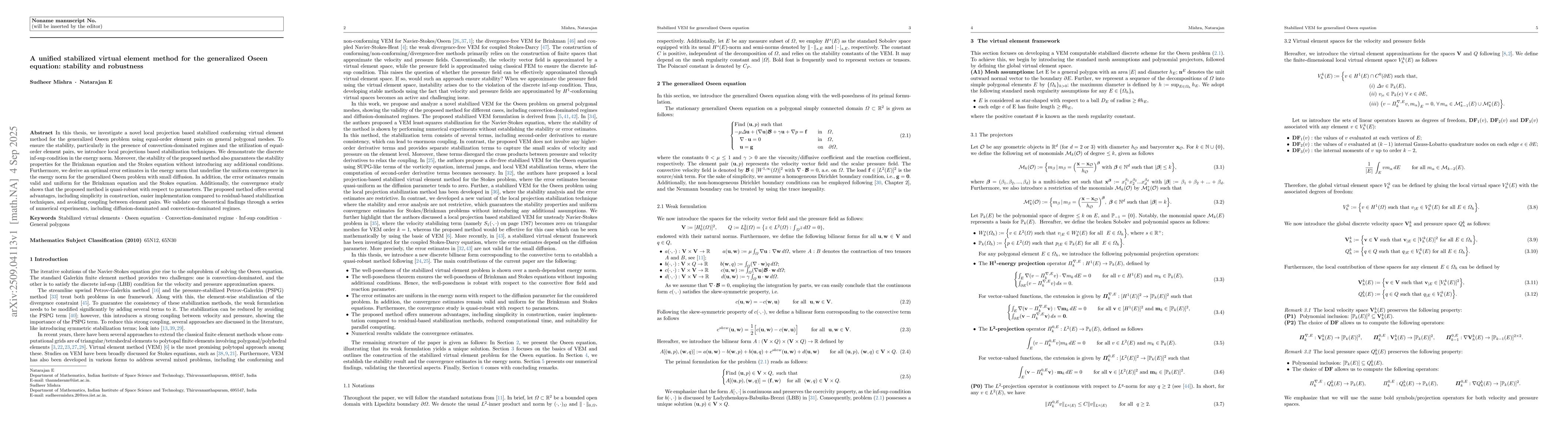 In this thesis, we investigate a novel local projection based stabilized conforming virtual element method for the generalized Oseen problem using equal-order element pairs on general polygonal meshes. To ensure the stability, particularly in the presence of convection-dominated regimes and the utilization of equal-order element pairs, we introduce local projections based stabilization techniques. We demonstrate the discrete inf-sup condition in the energy norm. Moreover, the stability of the proposed method also guarantees the stability properties for the Brinkman equation and the Stokes equation without introducing any additional conditions. Furthermore, we derive an optimal error estimates in the energy norm that underline the uniform convergence in the energy norm for the generalized Oseen problem with small diffusion. In addition, the error estimates remain valid and uniform for the Brinkman equation and the Stokes equation. Additionally, the convergence study shows that the proposed method is quasi-robust with respect to parameters. The proposed method offers several advantages, including simplicity in construction, easier implementation compared to residual-based stabilization techniques, and avoiding coupling between element pairs. We validate our theoretical findings through a series of numerical experiments, including diffusion-dominated and convection-dominated regimes.