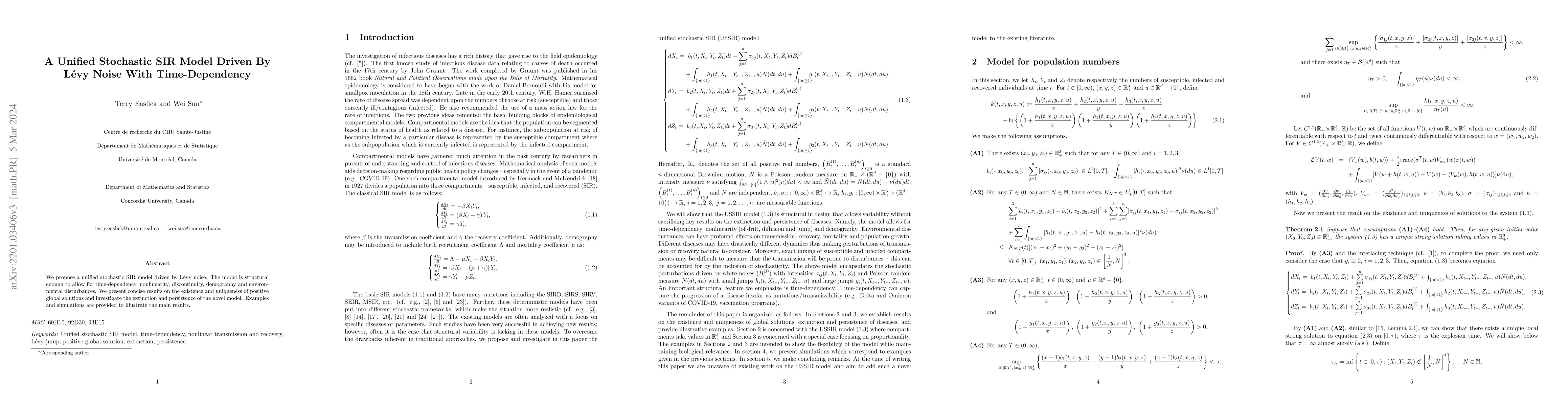 This paper proposes a unified stochastic SIR model incorporating Lévy noise and time-dependent features, examining its existence and uniqueness of positive global solutions, and studying the extinction and persistence behaviors, supported by simulations.
