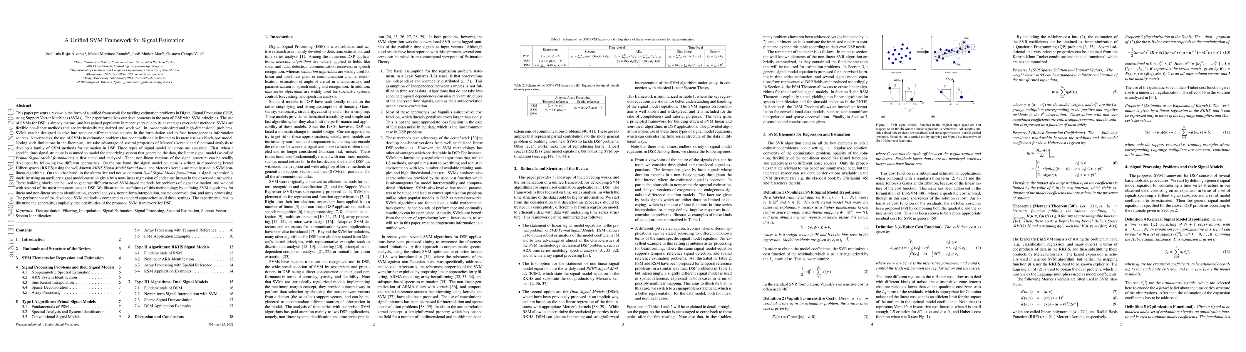 This paper develops a unified SVM framework for various signal estimation problems in DSP, leveraging Mercer's kernels and functional analysis to create novel SVM methods for linear and non-linear signal models, and demonstrates their effectiveness through various DSP applications.