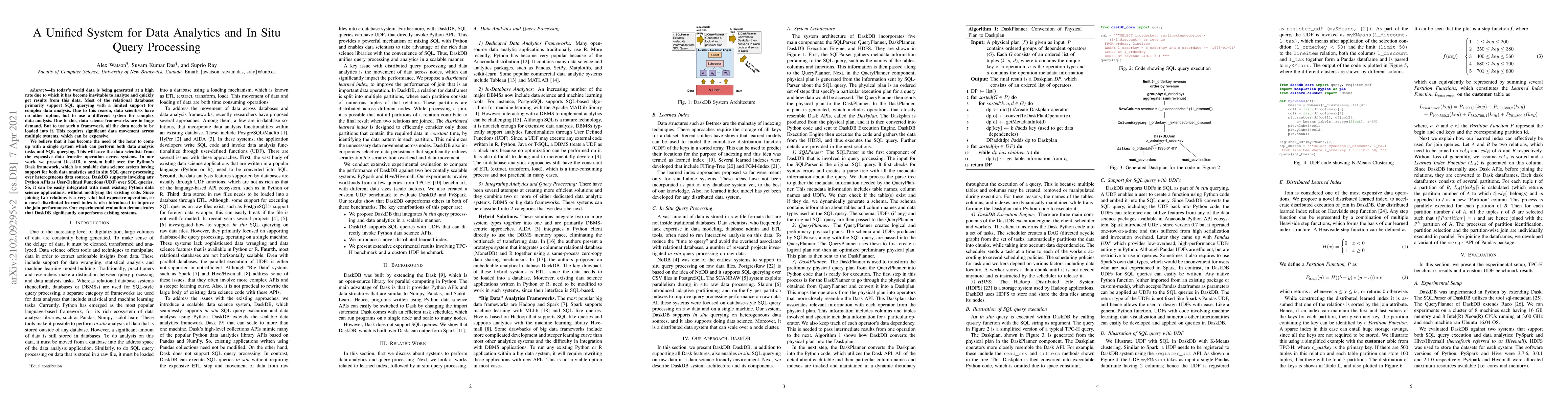 In today's world data is being generated at a high rate due to which it has become inevitable to analyze and quickly get results from this data. Most of the relational databases primarily support SQL querying with a limited support for complex data analysis. Due to this reason, data scientists have no other option, but to use a different system for complex data analysis. Due to this, data science frameworks are in huge demand. But to use such a framework, all the data needs to be loaded into it. This requires significant data movement across multiple systems, which can be expensive. We believe that it has become the need of the hour to come up with a single system which can perform both data analysis tasks and SQL querying. This will save the data scientists from the expensive data transfer operation across systems. In our work, we present DaskDB, a system built over the Python's Dask framework, which is a scalable data science system having support for both data analytics and in situ SQL query processing over heterogeneous data sources. DaskDB supports invoking any Python APIs as User-Defined Functions (UDF) over SQL queries. So, it can be easily integrated with most existing Python data science applications, without modifying the existing code. Since joining two relations is a very vital but expensive operation, so a novel distributed learned index is also introduced to improve the join performance. Our experimental evaluation demonstrates that DaskDB significantly outperforms existing systems.