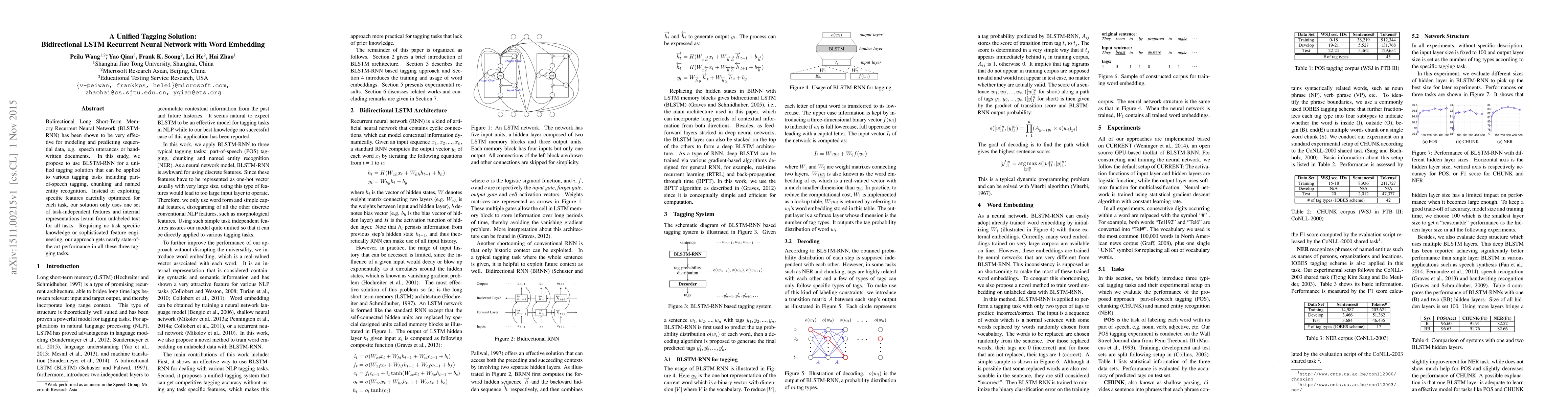 This paper proposes a unified tagging solution using a Bidirectional LSTM Recurrent Neural Network (BLSTM-RNN) with word embeddings, achieving state-of-the-art performance across part-of-speech tagging, chunking, and named entity recognition without task-specific features. The model leverages task-independent features and representations learned from unlabeled text.