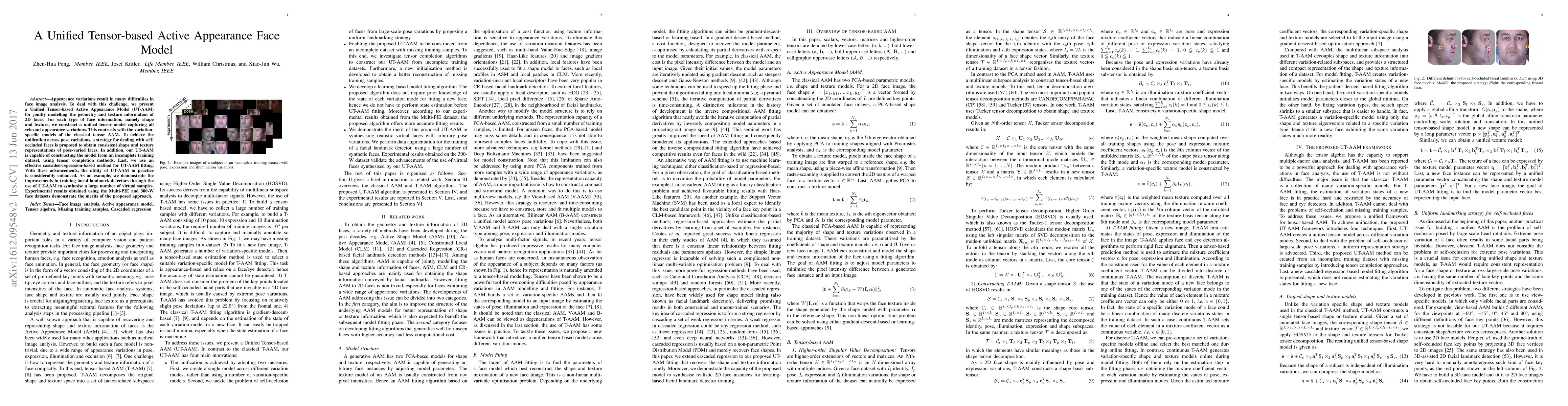 The paper presents a Unified Tensor-based Active Appearance Model (UT-AAM) to jointly model the geometry and texture of 2D faces, using tensor models for shape and texture that unify appearance variations. The UT-AAM can handle self-occlusions and incomplete datasets, and is shown to improve facial landmark detection through virtual sample synthesis.