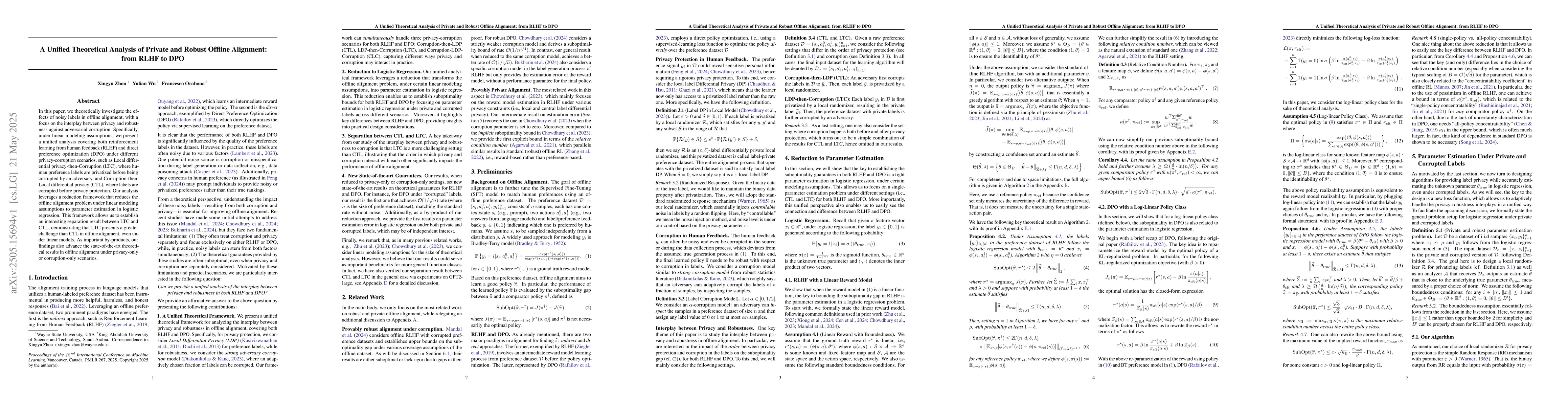 The paper presents a reduction framework linking offline alignment problems to logistic regression parameter estimation, facilitating a unified theoretical analysis of RLHF and DPO under various privacy-corruption scenarios.