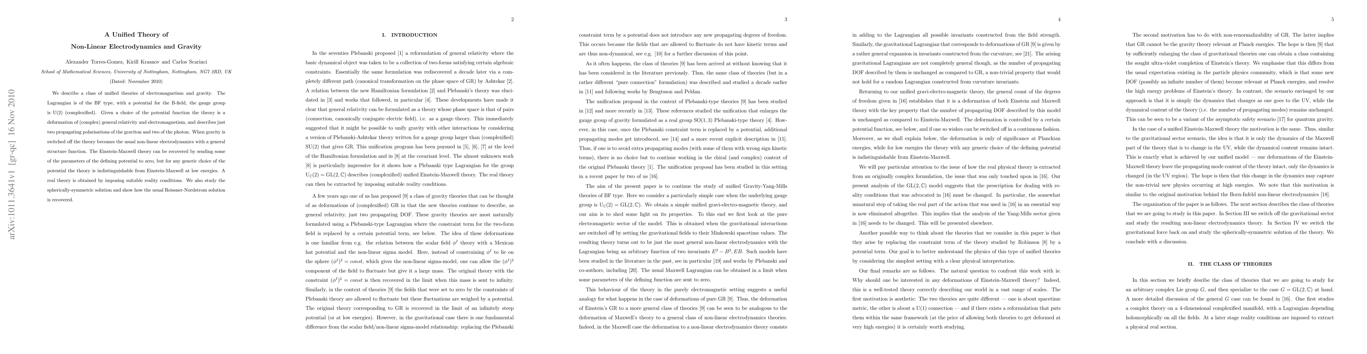 We describe a class of unified theories of electromagnetism and gravity. The Lagrangian is of the BF type, with a potential for the B-field, the gauge group is U(2) (complexified). Given a choice of the potential function the theory is a deformation of (complex) general relativity and electromagnetism, and describes just two propagating polarisations of the graviton and two of the photon. When gravity is switched off the theory becomes the usual non-linear electrodynamics with a general structure function. The Einstein-Maxwell theory can be recovered by sending some of the parameters of the defining potential to zero, but for any generic choice of the potential the theory is indistinguishable from Einstein-Maxwell at low energies. A real theory is obtained by imposing suitable reality conditions. We also study the spherically-symmetric solution and show how the usual Reissner-Nordstrom solution is recovered.