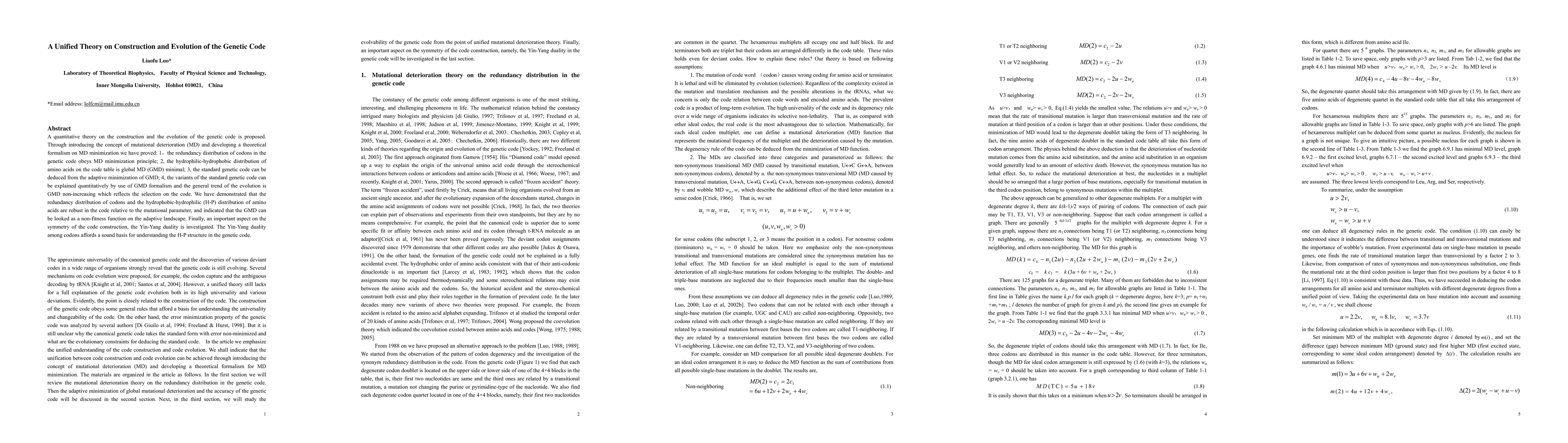 A quantitative theory on the construction and the evolution of the genetic code is proposed. Through introducing the concept of mutational deterioration (MD) and developing a theoretical formalism on MD minimization we have proved: 1, the redundancy distribution of codons in the genetic code obeys MD minimization principle; 2, the hydrophilic-hydrophobic distribution of amino acids on the code table is global MD (GMD) minimal; 3, the standard genetic code can be deduced from the adaptive minimization of GMD; 4, the variants of the standard genetic code can be explained quantitatively by use of GMD formalism and the general trend of the evolution is GMD non-increasing which reflects the selection on the code. We have demonstrated that the redundancy distribution of codons and the hydrophobic-hydrophilic (H-P) distribution of amino acids are robust in the code relative to the mutational parameter, and indicated that the GMD can be looked as a non-fitness function on the adaptive landscape. Finally, an important aspect on the symmetry of the code construction, the Yin-Yang duality is investigated. The Yin-Yang duality among codons affords a sound basis for understanding the H-P structure in the genetic code.