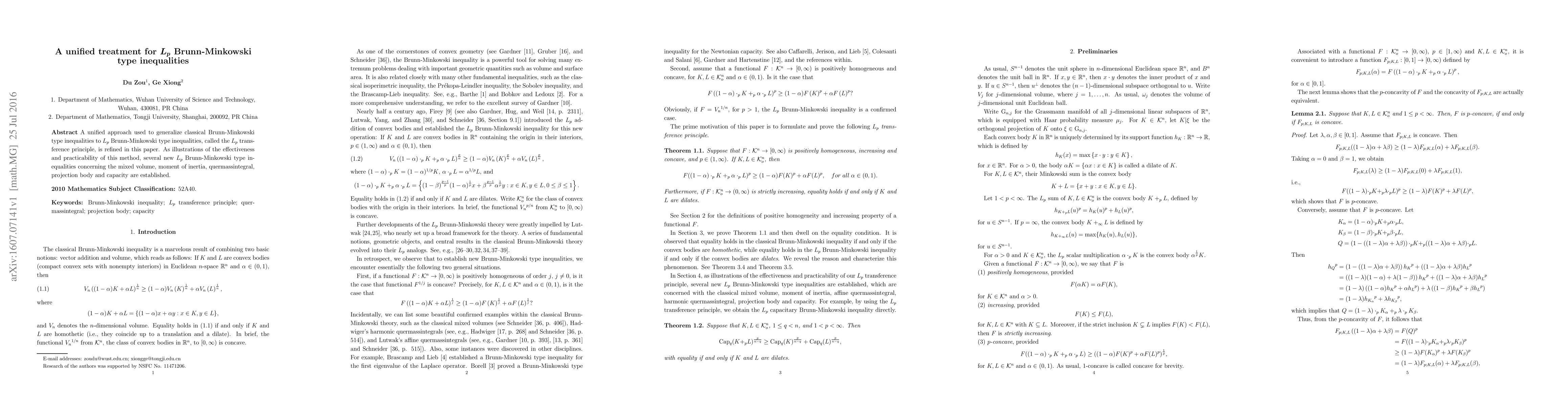 A unified approach used to generalize classical Brunn-Minkowski type inequalities to Lp Brunn-Minkowski type inequalities, called the Lp transference principle, is refined in this paper. As illustrations of the effectiveness and practicability of this method, several new Lp Brunn-Minkowski type inequalities concerning the mixed volume, moment of inertia, quermassintegral, projection body and capacity are established.