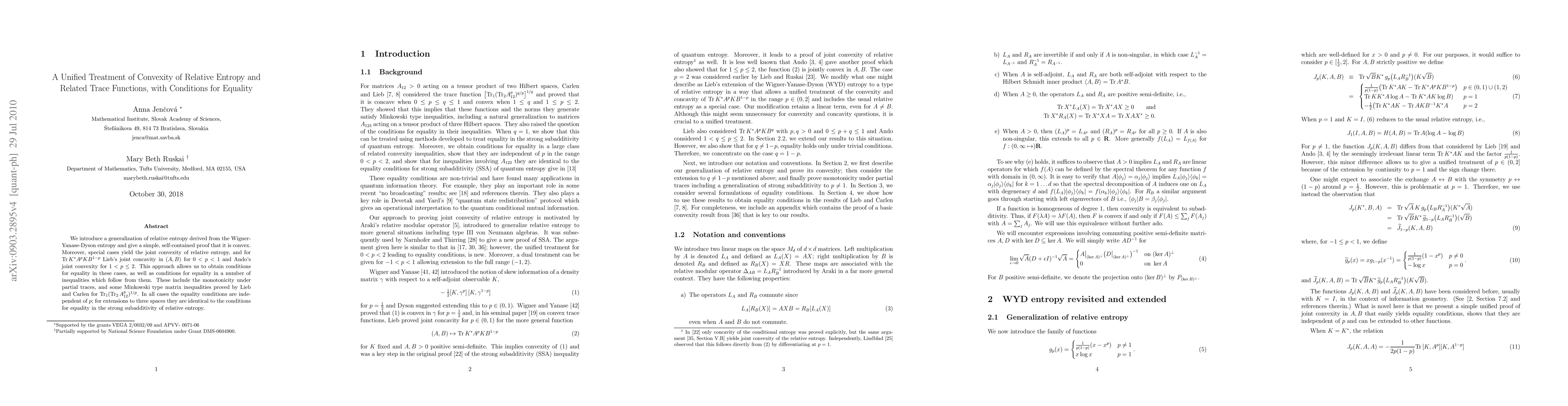 We introduce a generalization of relative entropy derived from the Wigner-Yanase-Dyson entropy and give a simple, self-contained proof that it is convex. Moreover, special cases yield the joint convexity of relative entropy, and for the map (A,B) --> Tr K^* A^p K B^{1-p} Lieb's joint concavity for 0 < p < 1 and Ando's joint convexity for 1 < p < 2. This approach allows us to obtain conditions for equality in these cases, as well as conditions for equality in a number of inequalities which follow from them. These include the monotonicity under partial traces, and some Minkowski type matrix inequalities proved by Lieb and Carlen for mixed (p,q) norms. In all cases the equality conditions are independent of p; for extensions to three spaces they are identical to the conditions for equality in the strong subadditivity of relative entropy.