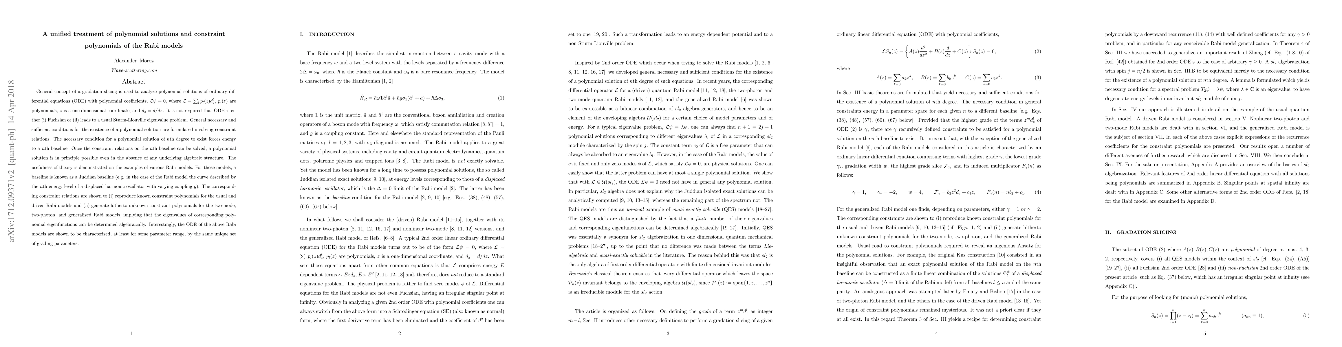 This paper develops a unified framework for analyzing polynomial solutions of ODEs with polynomial coefficients, using gradation slicing. It formulates necessary and sufficient conditions for polynomial solutions, demonstrating the theory through various Rabi models and showing the generation of new constraint polynomials.
