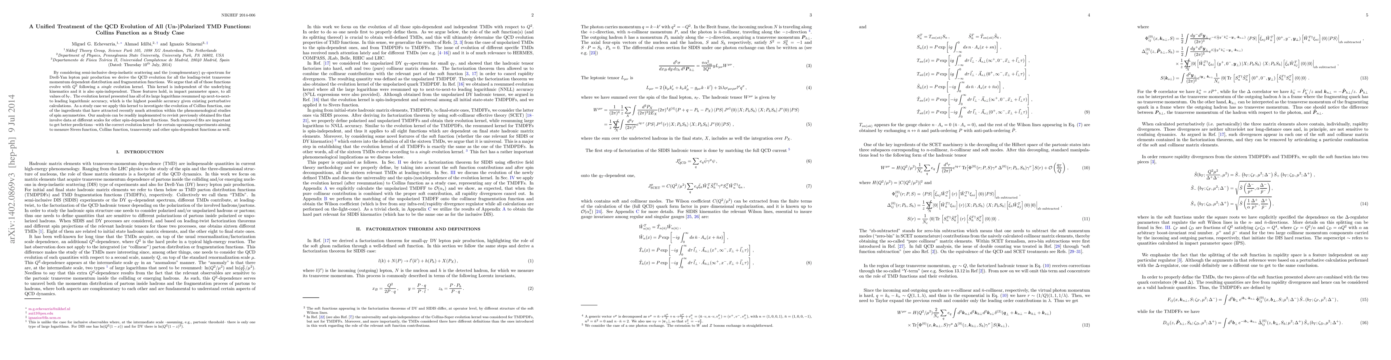 By considering semi-inclusive deep-inelastic scattering and the (complementary) $q_T$-spectrum for Drell-Yan lepton pair production we derive the QCD evolution for all the leading-twist transverse momentum dependent distribution and fragmentation functions. We argue that all of those functions evolve with $Q^2$ following a \emph{single} evolution kernel. This kernel is independent of the underlying kinematics and it is also spin-independent. Those features hold, in impact parameter space, to all values of $b_T$. The evolution kernel presented has all of its large logarithms resummed up next-to-next-to leading logarithmic accuracy, which is the highest possible accuracy given existing perturbative calculations. As a study case we apply this kernel to investigate the evolution of Collins function, one of the ingredients that have attracted recently much attention within the phenomenological studies of spin asymmetries. Our analysis can be readily implemented to revisit previously obtained fits that involve data at different scales for other spin-dependent functions. Such improved fits are important to get better predictions --with the correct evolution kernel-- for certain upcoming experiments aiming to measure Sivers function, Collins function, transversity and other spin-dependent functions as well.