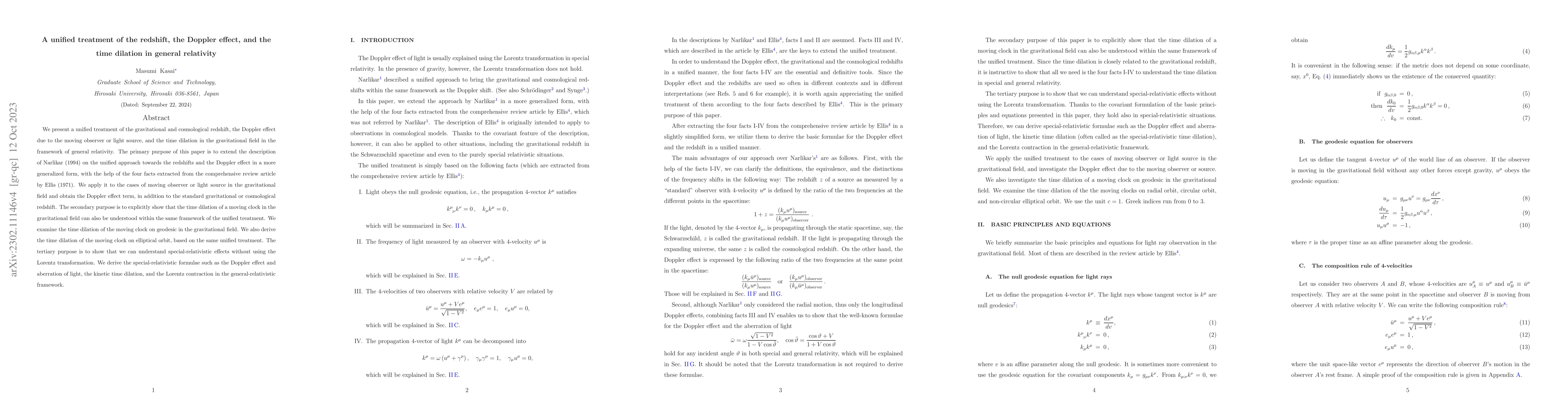 This paper provides a unified treatment of gravitational and cosmological redshift, the Doppler effect, and time dilation in general relativity, extending Narlikar's approach and incorporating insights from Ellis's review. It derives these effects without relying on Lorentz transformations, demonstrating their consistency within a general-relativistic framework.