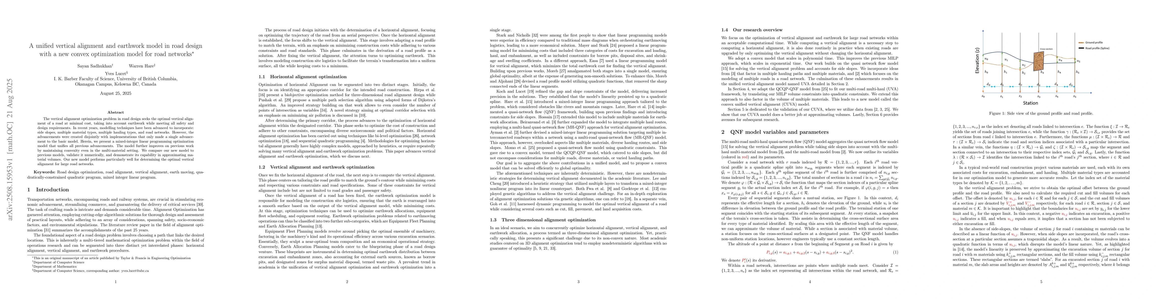 The vertical alignment optimization problem in road design seeks the optimal vertical alignment of a road at minimal cost, taking into account earthwork while meeting all safety and design requirements. In recent years, modelling techniques have been advanced to incorporate: side slopes, multiple material types, multiple hauling types, and road networks. However, the advancements were created disjointly with implementations that only made a single advancement to the basic model. Herein, we present a mixed-integer linear programming optimization model that unifies all previous advancements. The model further improves on previous work by maintaining convexity even in the multi-material setting. We compare our new model to previous models, validate it numerically, and demonstrate its capability in approximating material volumes. Our new model performs particularly well for determining the optimal vertical alignment for large road networks.