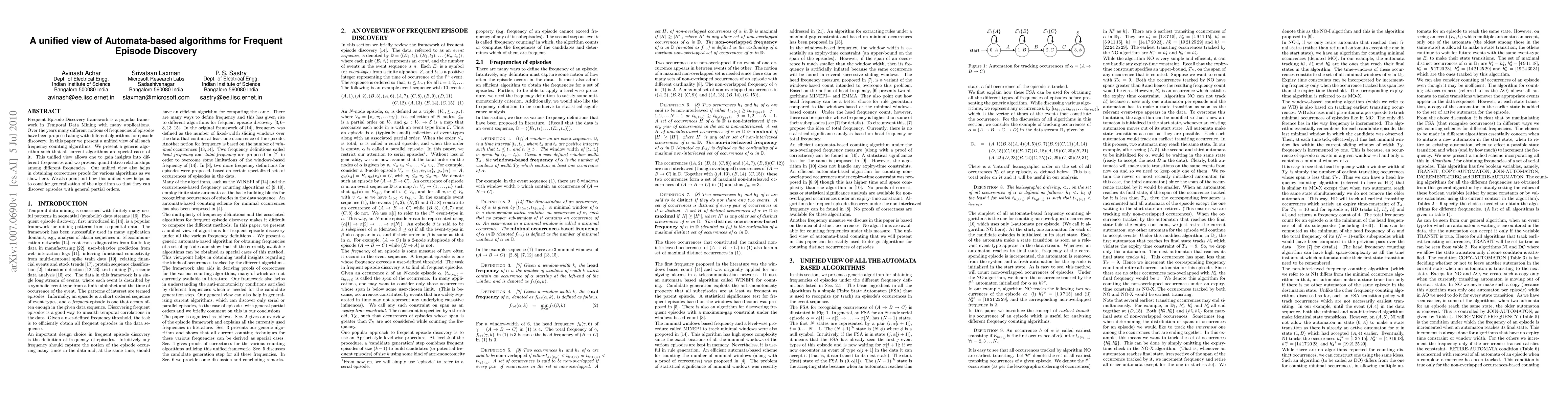 This paper presents a unified framework for various Automata-based algorithms used in frequent episode discovery within Temporal Data Mining. It introduces a generic algorithm encompassing all existing frequency counting methods, facilitating insights into different frequency measures and enabling correctness proofs.