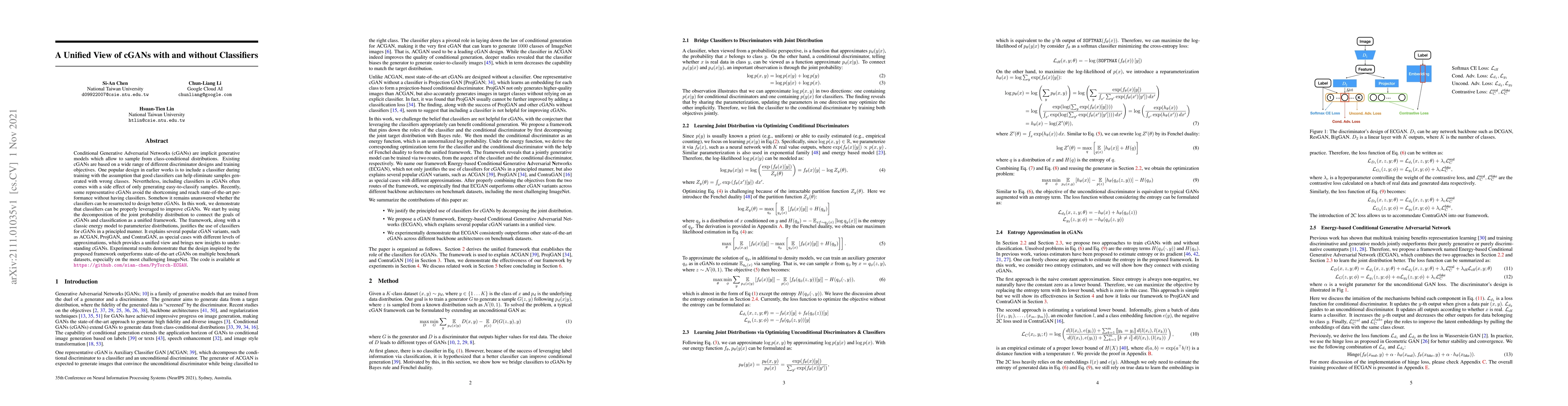Conditional Generative Adversarial Networks (cGANs) are implicit generative models which allow to sample from class-conditional distributions. Existing cGANs are based on a wide range of different discriminator designs and training objectives. One popular design in earlier works is to include a classifier during training with the assumption that good classifiers can help eliminate samples generated with wrong classes. Nevertheless, including classifiers in cGANs often comes with a side effect of only generating easy-to-classify samples. Recently, some representative cGANs avoid the shortcoming and reach state-of-the-art performance without having classifiers. Somehow it remains unanswered whether the classifiers can be resurrected to design better cGANs. In this work, we demonstrate that classifiers can be properly leveraged to improve cGANs. We start by using the decomposition of the joint probability distribution to connect the goals of cGANs and classification as a unified framework. The framework, along with a classic energy model to parameterize distributions, justifies the use of classifiers for cGANs in a principled manner. It explains several popular cGAN variants, such as ACGAN, ProjGAN, and ContraGAN, as special cases with different levels of approximations, which provides a unified view and brings new insights to understanding cGANs. Experimental results demonstrate that the design inspired by the proposed framework outperforms state-of-the-art cGANs on multiple benchmark datasets, especially on the most challenging ImageNet. The code is available at https://github.com/sian-chen/PyTorch-ECGAN.