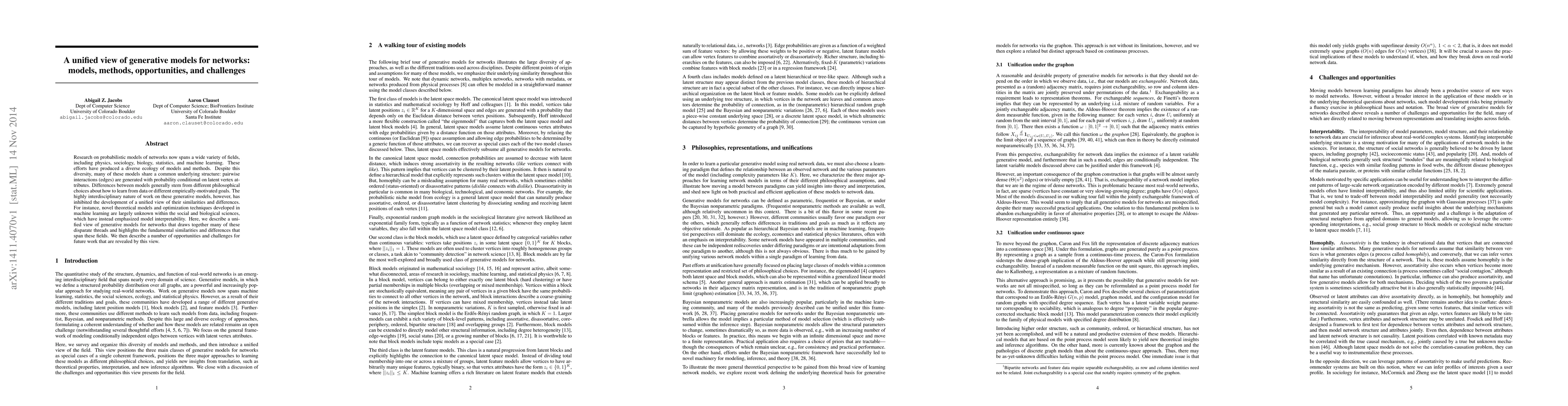 This paper proposes a unified view of generative models for networks, highlighting similarities and differences across various fields, and identifying opportunities and challenges for future research. It aims to bridge the gap between machine learning and interdisciplinary approaches to network modeling.