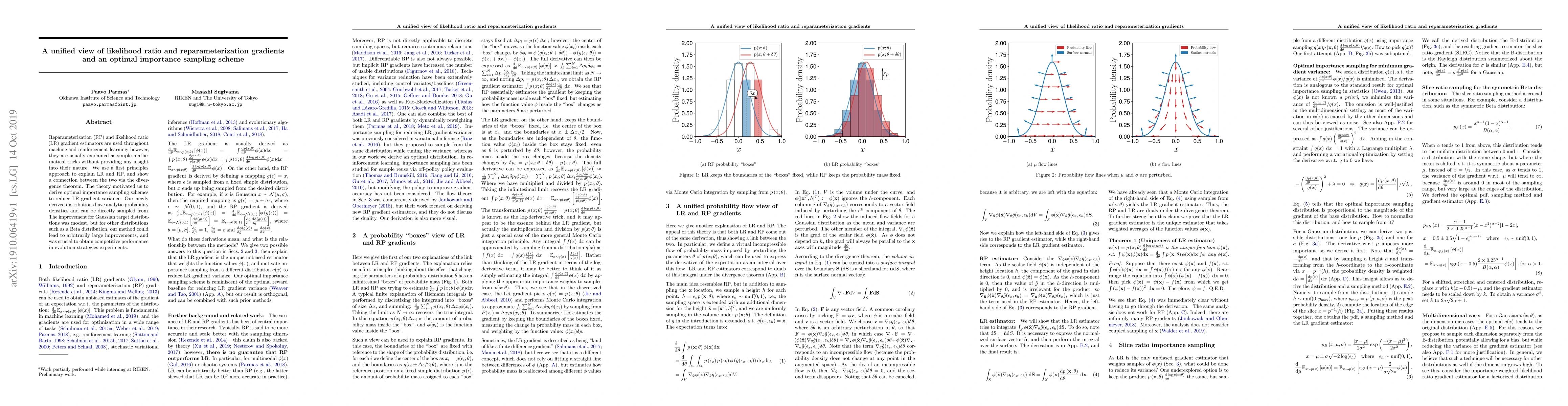 Reparameterization (RP) and likelihood ratio (LR) gradient estimators are used throughout machine and reinforcement learning; however, they are usually explained as simple mathematical tricks without providing any insight into their nature. We use a first principles approach to explain LR and RP, and show a connection between the two via the divergence theorem. The theory motivated us to derive optimal importance sampling schemes to reduce LR gradient variance. Our newly derived distributions have analytic probability densities and can be directly sampled from. The improvement for Gaussian target distributions was modest, but for other distributions such as a Beta distribution, our method could lead to arbitrarily large improvements, and was crucial to obtain competitive performance in evolution strategies experiments.