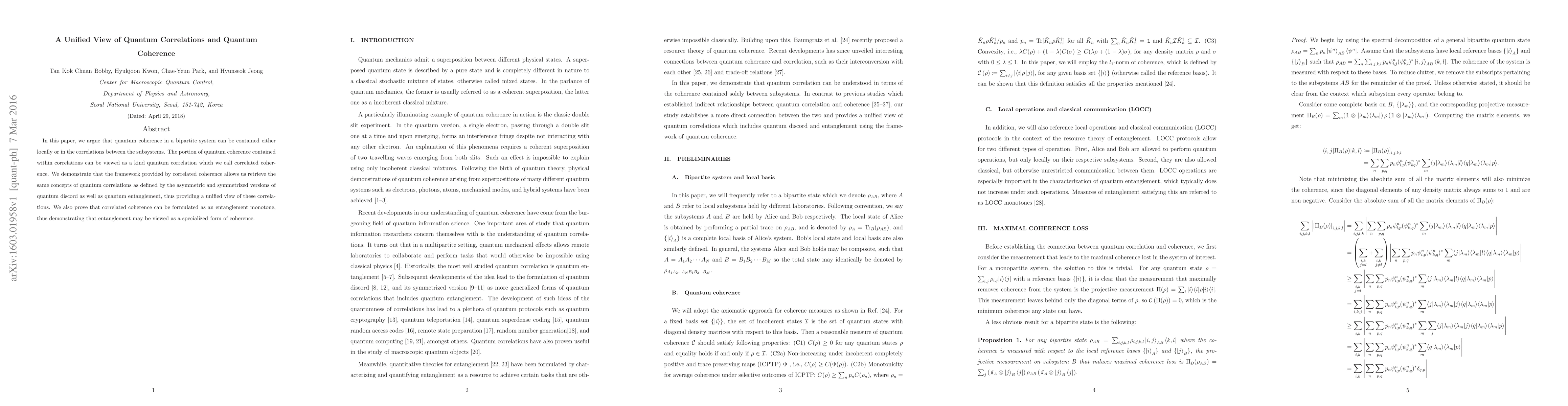 This paper proposes a unified framework for understanding quantum coherence and correlations, introducing "correlated coherence" to describe the portion of coherence in bipartite systems that resides in their correlations. It shows that this concept encompasses quantum discord and entanglement, and proves that correlated coherence can act as an entanglement monotone.