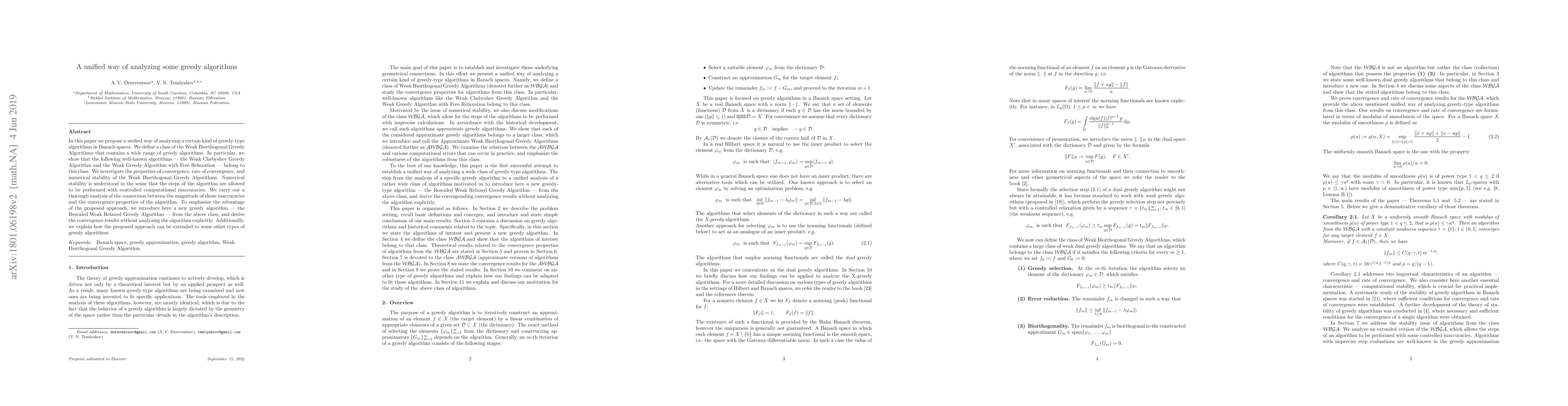 In this paper we propose a unified way of analyzing a certain kind of greedy-type algorithms in Banach spaces. We define a class of the Weak Biorthogonal Greedy Algorithms that contains a wide range of greedy algorithms. In particular, we show that the following well-known algorithms --- the Weak Chebyshev Greedy Algorithm and the Weak Greedy Algorithm with Free Relaxation --- belong to this class. We investigate the properties of convergence, rate of convergence, and numerical stability of the Weak Biorthogonal Greedy Algorithms. Numerical stability is understood in the sense that the steps of the algorithm are allowed to be performed with controlled computational inaccuracies. We carry out a thorough analysis of the connection between the magnitude of those inaccuracies and the convergence properties of the algorithm. To emphasize the advantage of the proposed approach, we introduce here a new greedy algorithm --- the Rescaled Weak Relaxed Greedy Algorithm --- from the above class, and derive the convergence results without analyzing the algorithm explicitly. Additionally, we explain how the proposed approach can be extended to some other types of greedy algorithms.