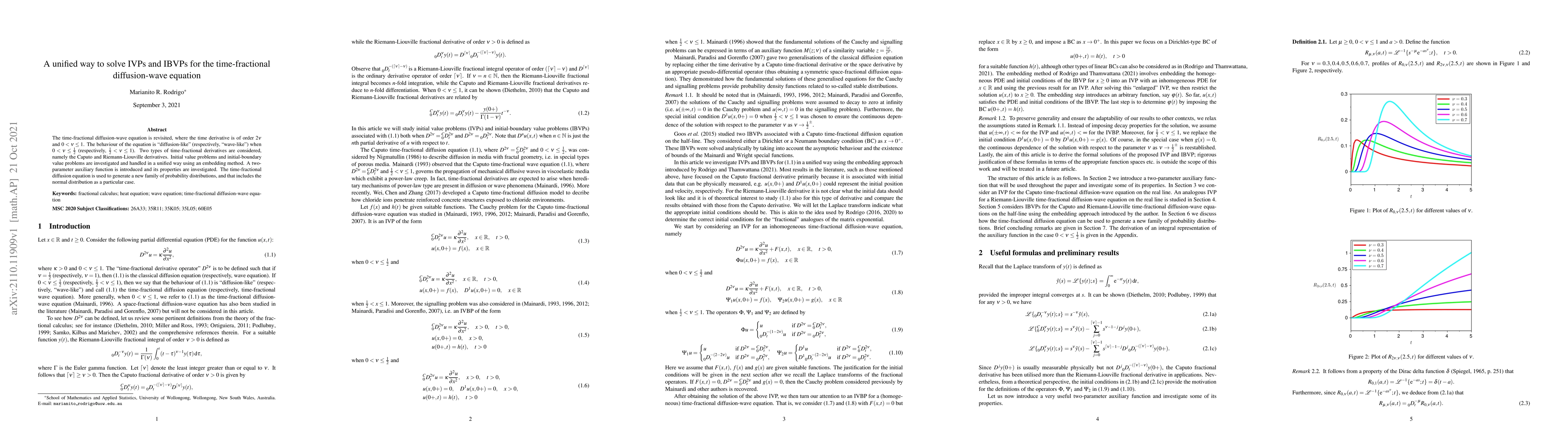 The time-fractional diffusion-wave equation is revisited, where the time derivative is of order $2 \nu$ and $0 < \nu \le 1$. The behaviour of the equation is "diffusion-like" (respectively, "wave-like") when $0 < \nu \le \frac{1}{2}$ (respectively, $\frac{1}{2} < \nu \le 1$). Two types of time-fractional derivatives are considered, namely the Caputo and Riemann-Liouville derivatives. Initial value problems and initial-boundary value problems are investigated and handled in a unified way using an embedding method. A two-parameter auxiliary function is introduced and its properties are investigated. The time-fractional diffusion equation is used to generate a new family of probability distributions, and that includes the normal distribution as a particular case.