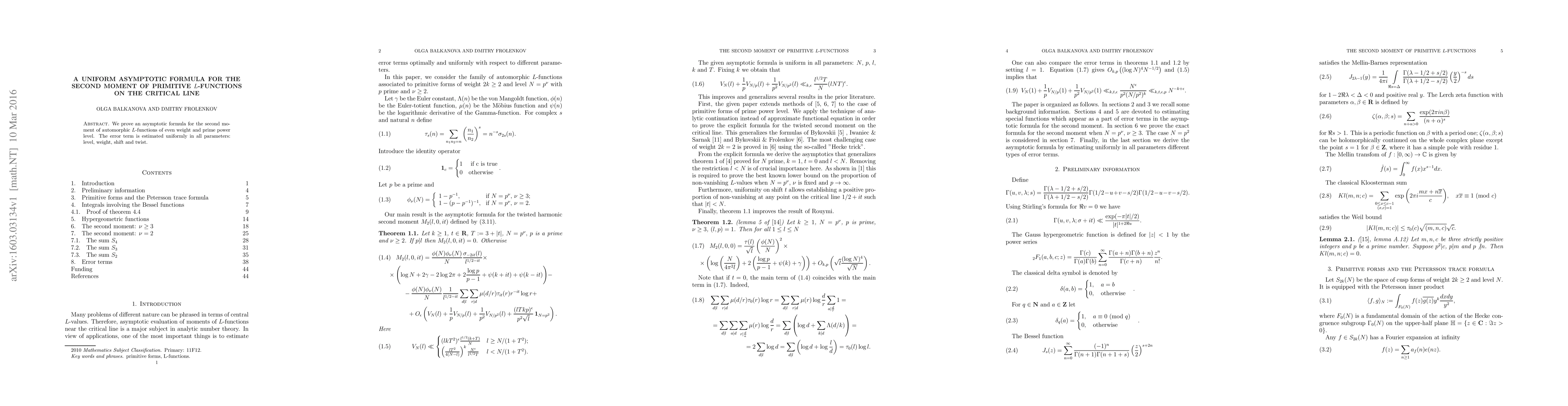 Summary: This paper establishes a uniform asymptotic formula for the second moment of primitive L-functions on the critical line, with a uniformly estimated error term across all parameters including level, weight, shift, and twist.