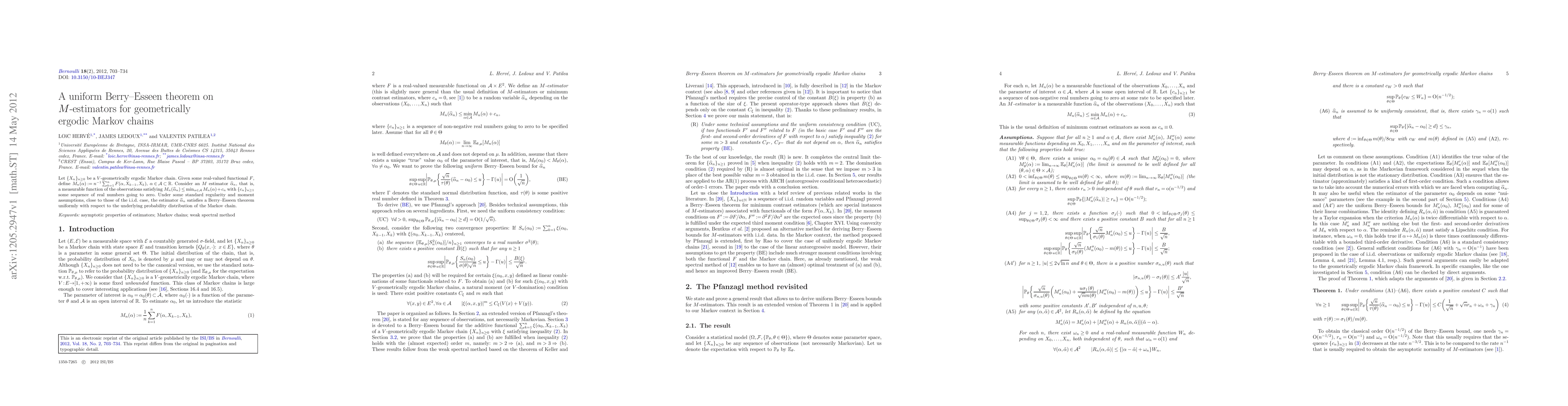 Let $\{X_n\}_{n\ge0}$ be a $V$-geometrically ergodic Markov chain. Given some real-valued functional $F$, define $M_n(\alpha):=n^{-1}\sum_{k=1}^nF(\alpha,X_{k-1},X_k)$, $\alpha\in\mathcal{A}\subset \mathbb {R}$. Consider an $M$ estimator $\hat{\alpha}_n$, that is, a measurable function of the observations satisfying $M_n(\hat{\alpha}_n)\leq \min_{\alpha\in\mathcal{A}}M_n(\alpha)+c_n$ with $\{c_n\}_{n\geq1}$ some sequence of real numbers going to zero. Under some standard regularity and moment assumptions, close to those of the i.i.d. case, the estimator $\hat{\alpha}_n$ satisfies a Berry--Esseen theorem uniformly with respect to the underlying probability distribution of the Markov chain.