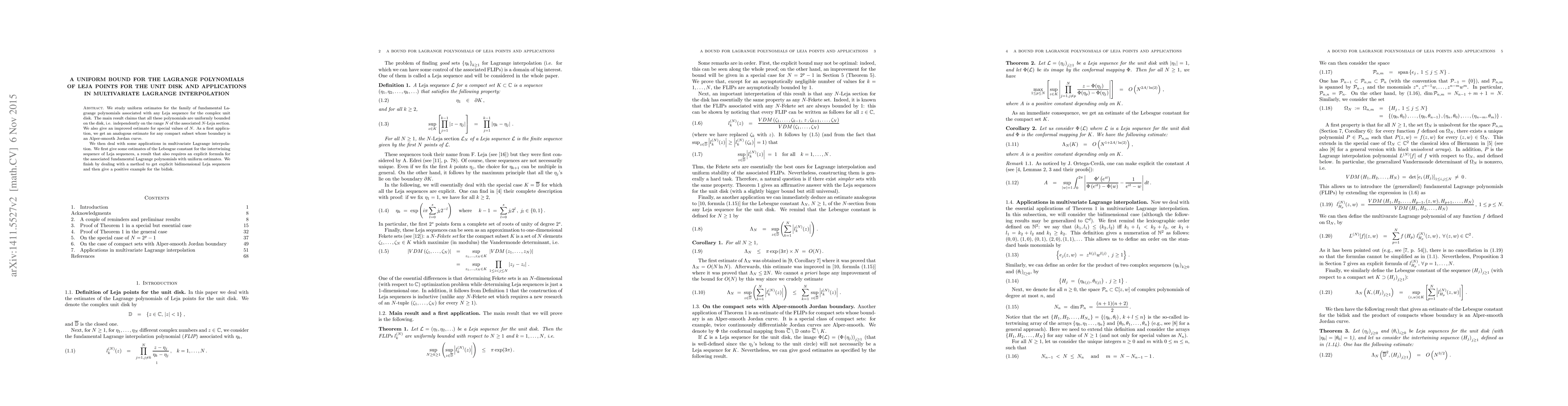 This paper establishes uniform bounds for Lagrange polynomials associated with Leja points in the unit disk, proving they remain bounded regardless of the size of the Leja section. It extends these bounds to compact subsets with smooth boundaries and applies the results to multivariate Lagrange interpolation, providing estimates for the Lebesgue constant and constructing explicit bidimensional Leja sequences for the bidisk.