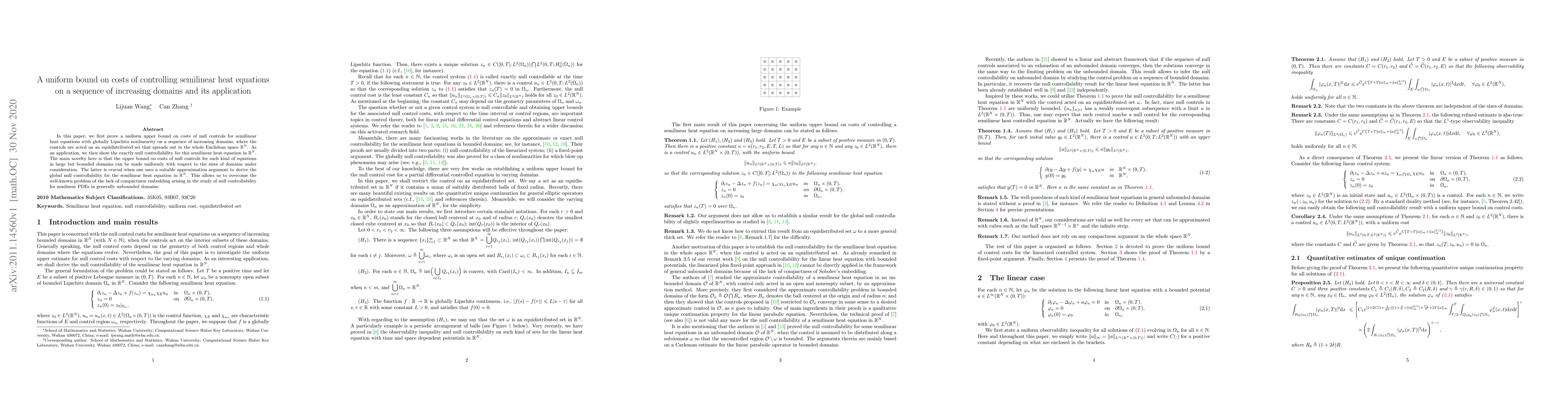 This paper establishes a uniform upper bound on the costs of null controls for semilinear heat equations on a sequence of increasing domains, demonstrating exact null controllability in R^N. The key innovation is the uniform cost bound for large but bounded domains, which aids in overcoming compactness issues in nonlinear PDEs.