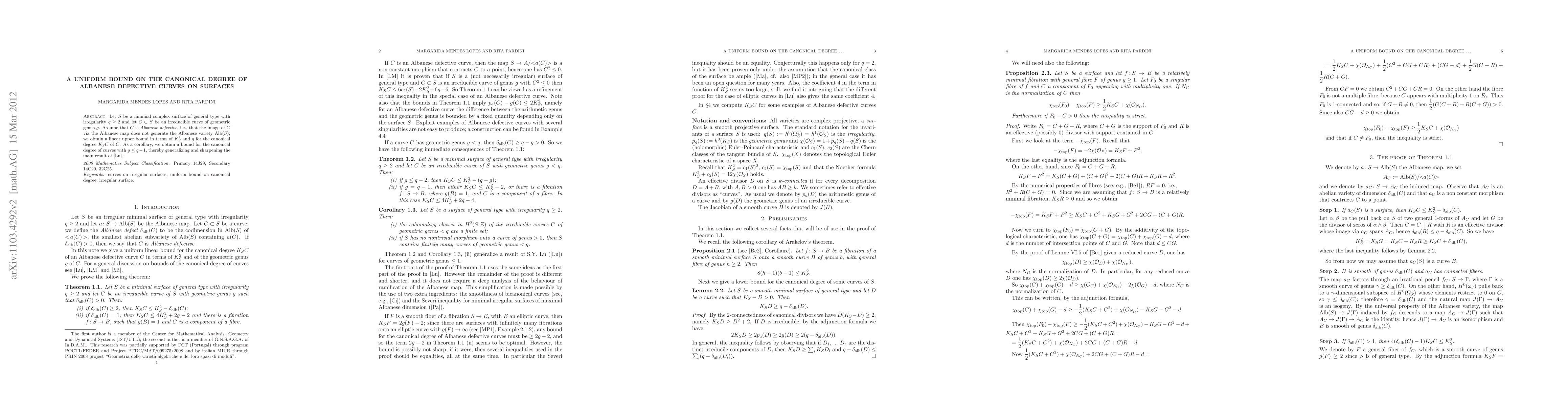 Researchers found a uniform bound on the canonical degree of Albanese defective curves on surfaces, improving a previous result and generalizing it to more complex cases.