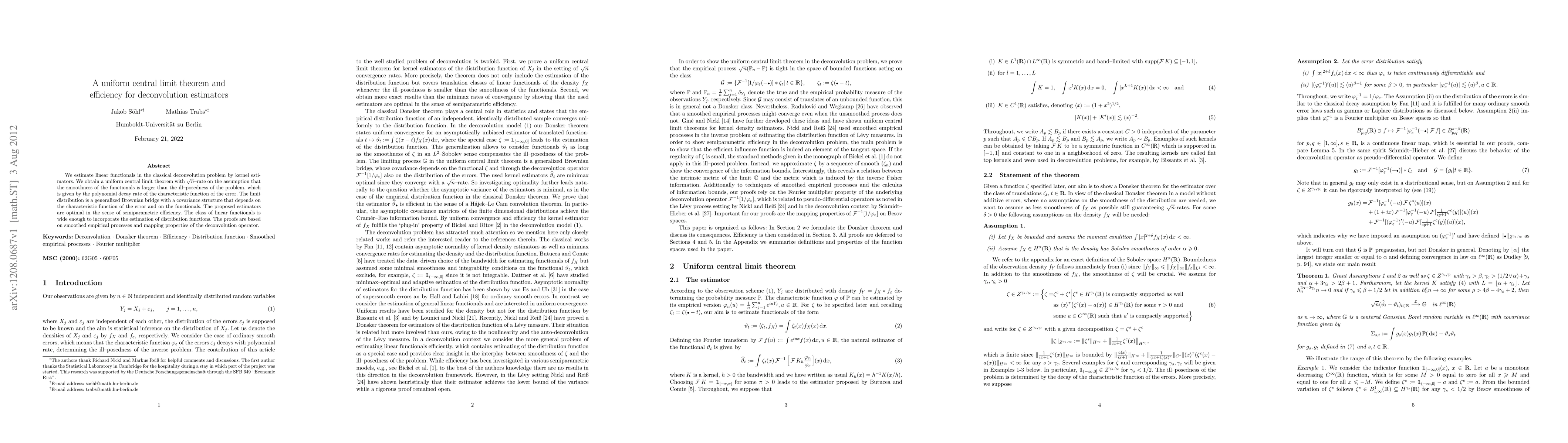 This paper develops kernel estimators for linear functionals in deconvolution problems, proving a uniform central limit theorem with $\sqrt{n}$-rate. The estimators achieve semiparametric efficiency and incorporate the estimation of distribution functions, with proofs relying on smoothed empirical processes and deconvolution operator properties.