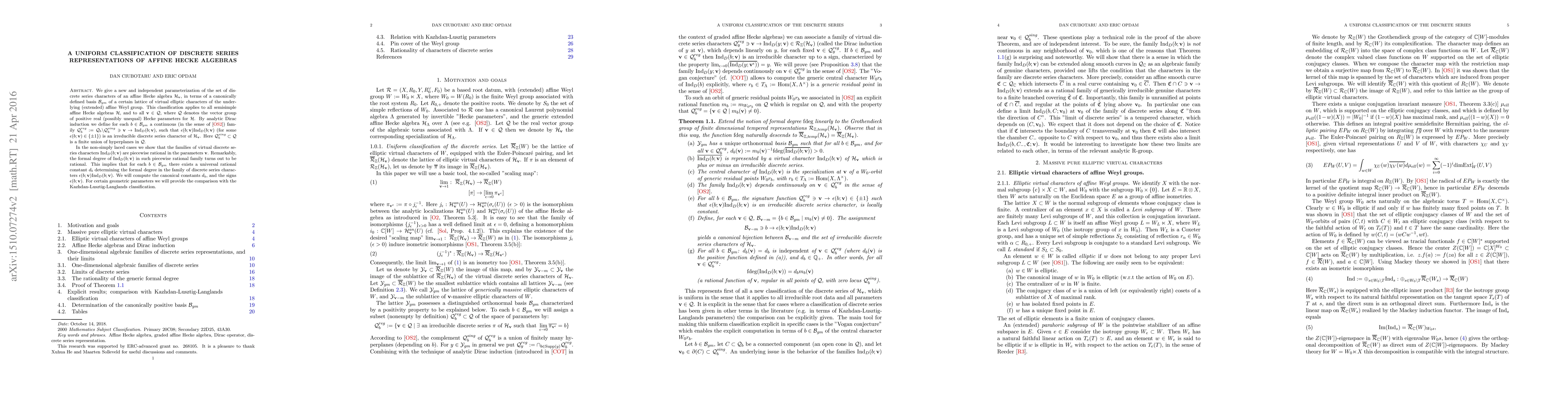 The paper presents a new classification of discrete series representations of affine Hecke algebras using a basis of virtual elliptic characters. It defines a family of discrete series characters parameterized by a canonical basis and computes associated constants, comparing the results with the Kazhdan-Lusztig-Langlands classification for specific parameters.