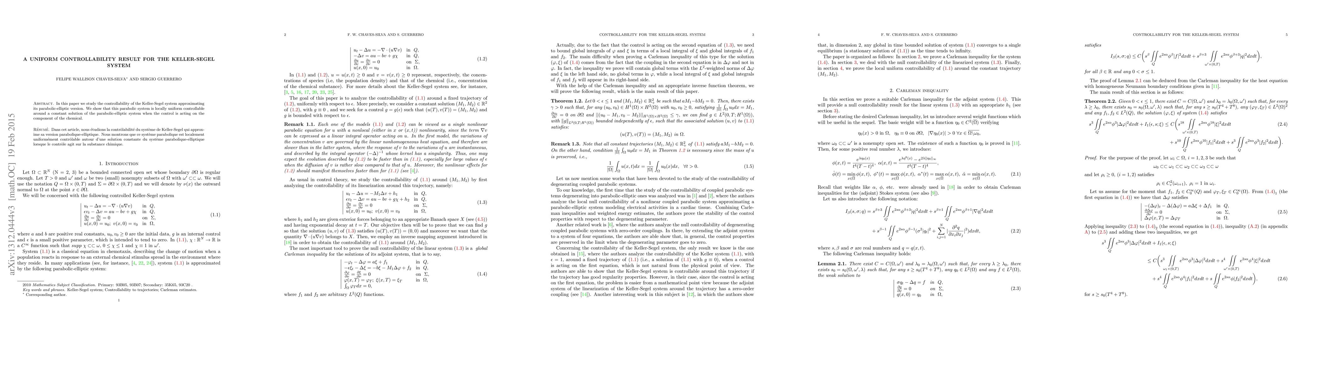 In this paper we study the controllability of the Keller-Segel system approximating its parabolic-elliptic version. We show that this parabolic system is locally uniform controllable around a constant solution of the parabolic-elliptic system when the control is acting on the component of the chemical.