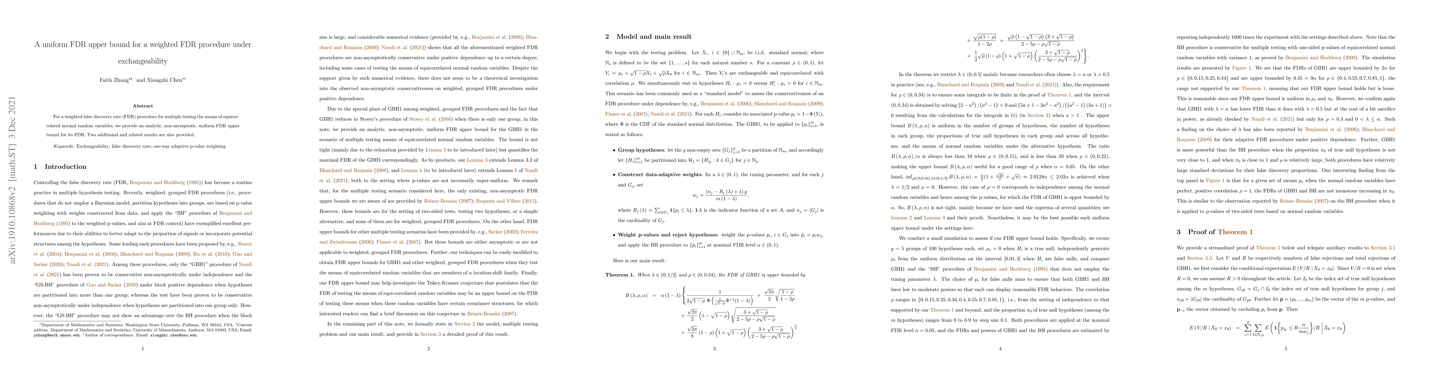 For a weighted false discovery rate (FDR) procedure for multiple testing the means of equicorrelated normal random variables, we provide an analytic, non-asymptotic, uniform FDR upper bound for its FDR. Two additional and related results are also provided.