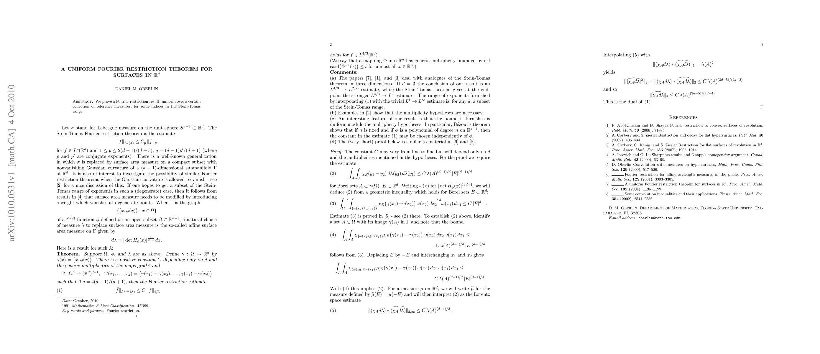 Researchers prove a uniform Fourier restriction theorem for surfaces in R^d, allowing certain indices to be restricted in a way that is independent of the reference measure used.