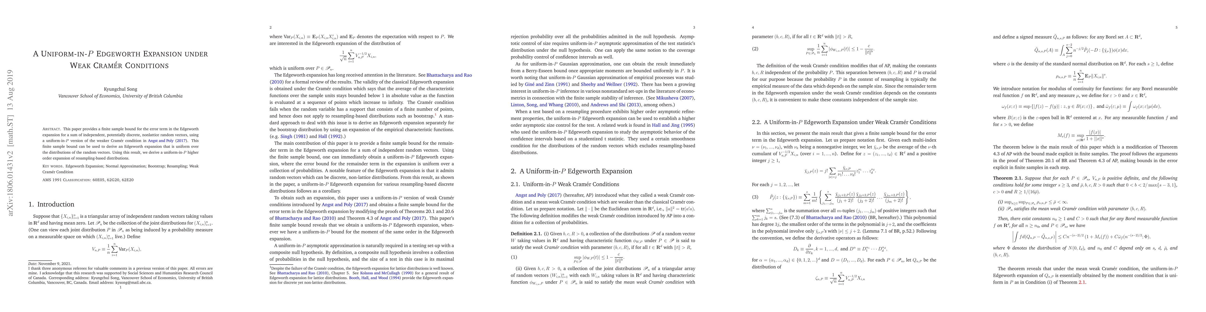 This paper provides a finite sample bound for the error term in the Edgeworth expansion for a sum of independent, potentially discrete, nonlattice random vectors, using a uniform-in-$P$ version of the weaker Cram\'{e}r condition in Angst and Poly (2017). This finite sample bound can be used to derive an Edgeworth expansion that is uniform over the distributions of the random vectors. Using this result, we derive a uniform-in-$P$ higher order expansion of resampling-based distributions.