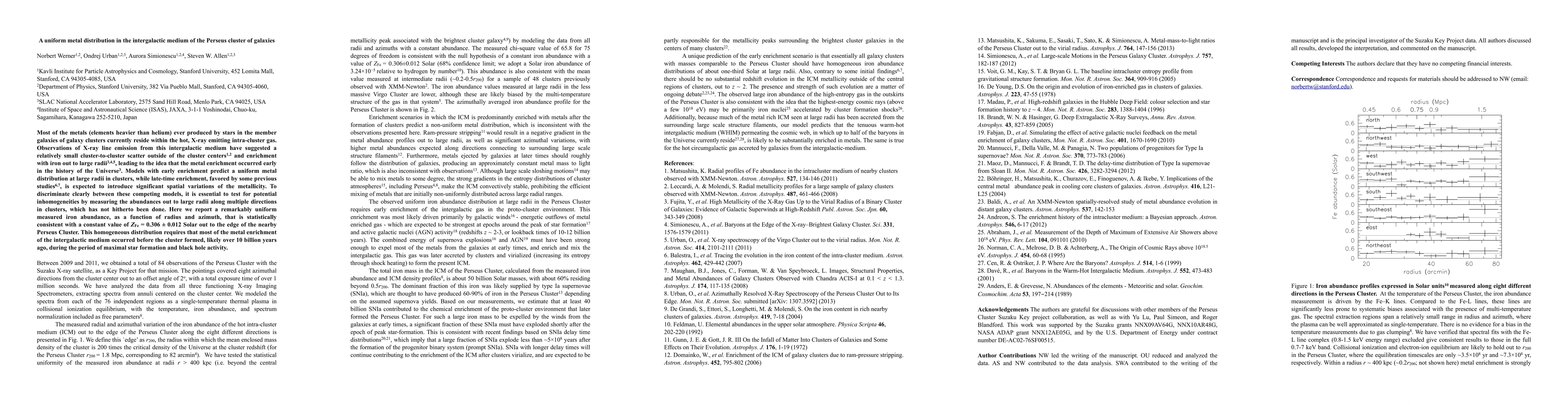 This paper reports a remarkably uniform iron abundance in the Perseus Cluster, indicating a consistent metal distribution out to the cluster's edge, supporting early metal enrichment models over late-time enrichment scenarios. This suggests most metal enrichment occurred billions of years ago during peak star formation and black hole activity.