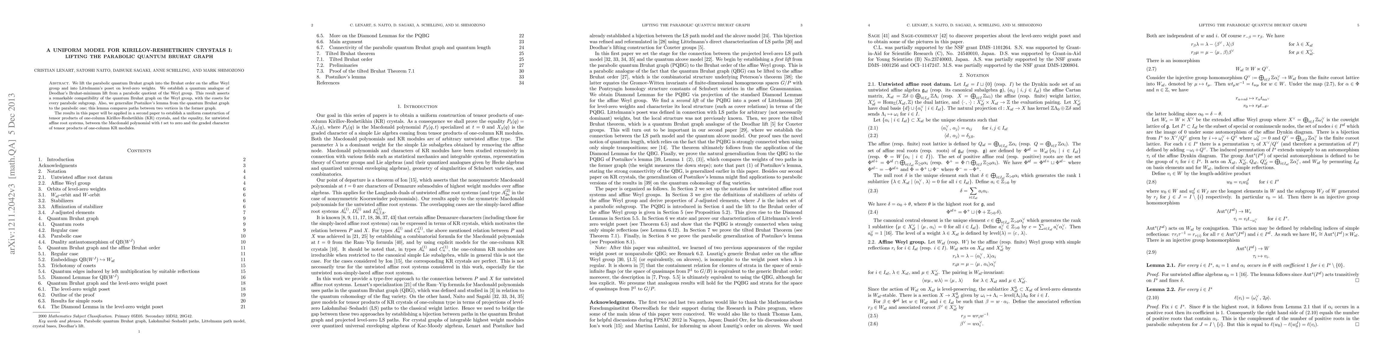 We lift the parabolic quantum Bruhat graph into the Bruhat order on the affine Weyl group and into Littelmann's poset on level-zero weights. We establish a quantum analogue of Deodhar's Bruhat-minimum lift from a parabolic quotient of the Weyl group. This result asserts a remarkable compatibility of the quantum Bruhat graph on the Weyl group, with the cosets for every parabolic subgroup. Also, we generalize Postnikov's lemma from the quantum Bruhat graph to the parabolic one; this lemma compares paths between two vertices in the former graph. The results in this paper will be applied in a second paper to establish a uniform construction of tensor products of one-column Kirillov-Reshetikhin (KR) crystals, and the equality, for untwisted affine root systems, between the Macdonald polynomial with t set to zero and the graded character of tensor products of one-column KR modules.