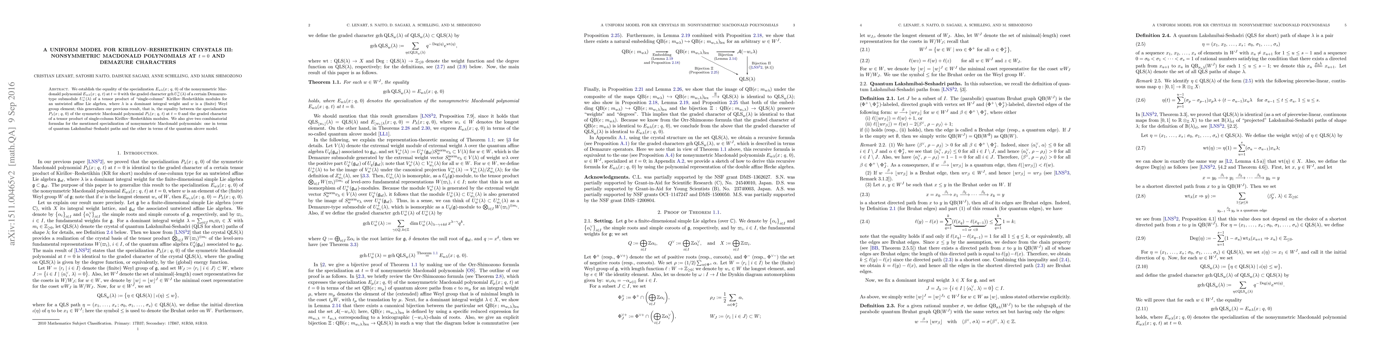 This paper establishes an equality between a specialization of a nonsymmetric Macdonald polynomial and the graded character of a tensor product of Kirillov-Reshetikhin modules at t=0, with implications for combinatorial formulas and generalizations of previous results.