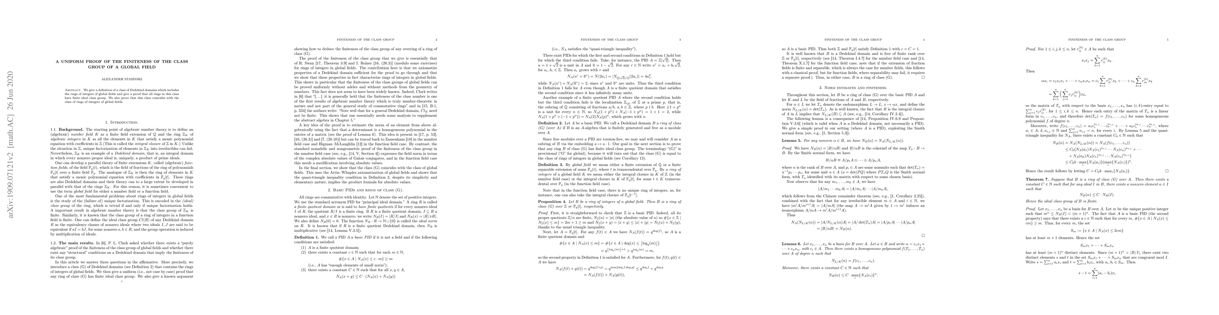 We give a definition of a class of Dedekind domains which includes the rings of integers of global fields and give a proof that all rings in this class have finite ideal class group. We also prove that this class coincides with the class of rings of integers of global fields.