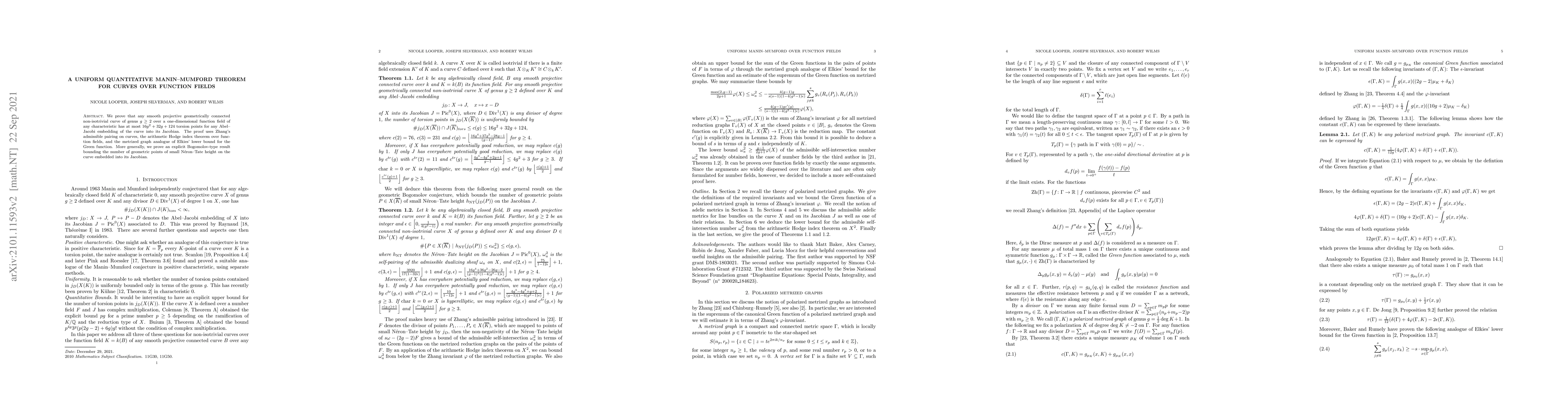 This paper establishes a uniform quantitative Manin-Mumford theorem for curves over function fields, limiting torsion points in Abel-Jacobi embeddings to 16g^2+32g+124 for genus g≥2 curves. It employs Zhang's admissible pairing, arithmetic Hodge index theorem, and Elkies' lower bound for the Green function, also proving a Bogomolov-type result for small Neron-Tate height points.