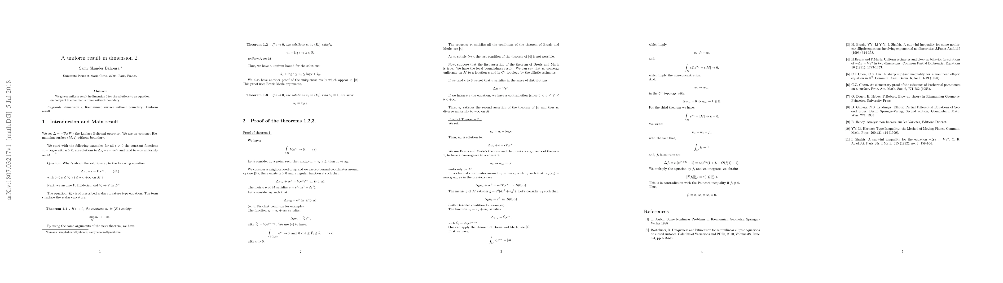 We give a uniqueness result in dimension 2 for the solutions to an equation on compact Riemannian surface without boundary.
