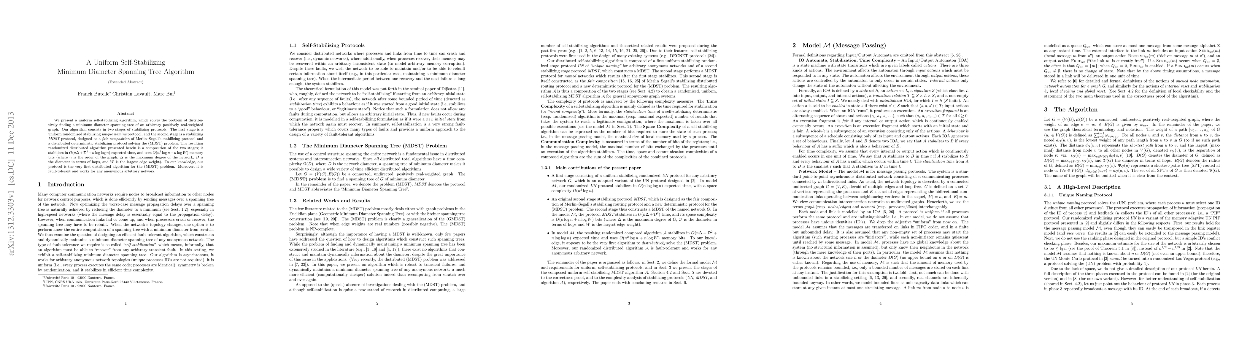 We present a uniform self-stabilizing algorithm, which solves the problem of distributively finding a minimum diameter spanning tree of an arbitrary positively real-weighted graph. Our algorithm consists in two stages of stabilizing protocols. The first stage is a uniform randomized stabilizing {\em unique naming} protocol, and the second stage is a stabilizing {\em MDST} protocol, designed as a {\em fair composition} of Merlin--Segall's stabilizing protocol and a distributed deterministic stabilizing protocol solving the (MDST) problem. The resulting randomized distributed algorithm presented herein is a composition of the two stages; it stabilizes in $O(n\Delta+{\cal D}^2 + n \log\log n)$ expected time, and uses $O(n^2\log n + n \log W)$ memory bits (where $n$ is the order of the graph, $\Delta$ is the maximum degree of the network, $\cal D$ is the diameter in terms of hops, and $W$ is the largest edge weight). To our knowledge, our protocol is the very first distributed algorithm for the (MDST) problem. Moreover, it is fault-tolerant and works for any anonymous arbitrary network.