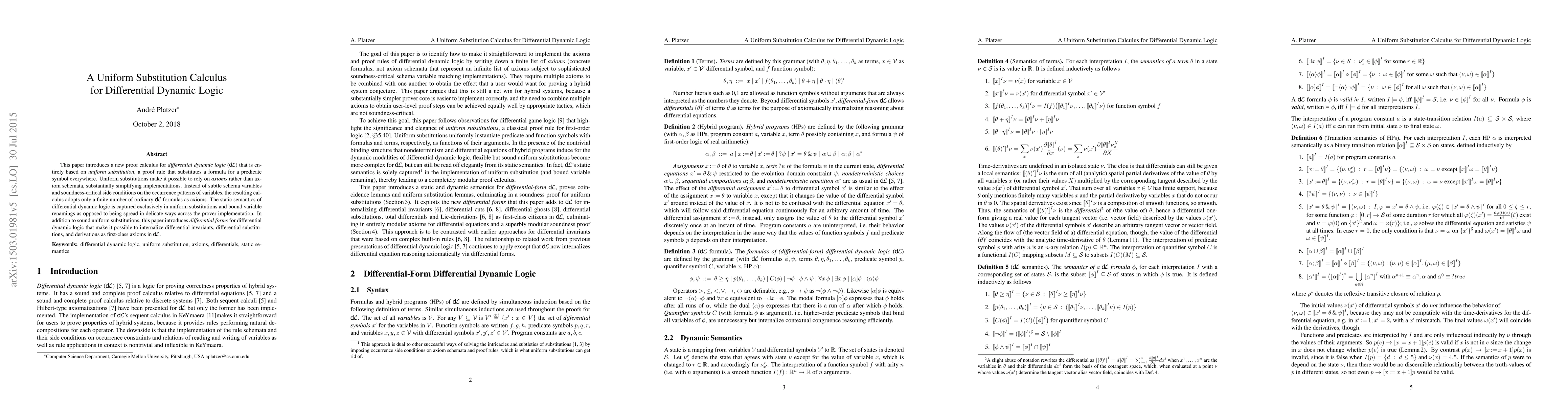 This paper proposes a uniform substitution calculus for differential dynamic logic (dL) that simplifies proofs by relying on axioms instead of axiom schemata, using uniform substitutions to replace predicate symbols. It achieves a streamlined static semantics through uniform substitutions and variable renamings.