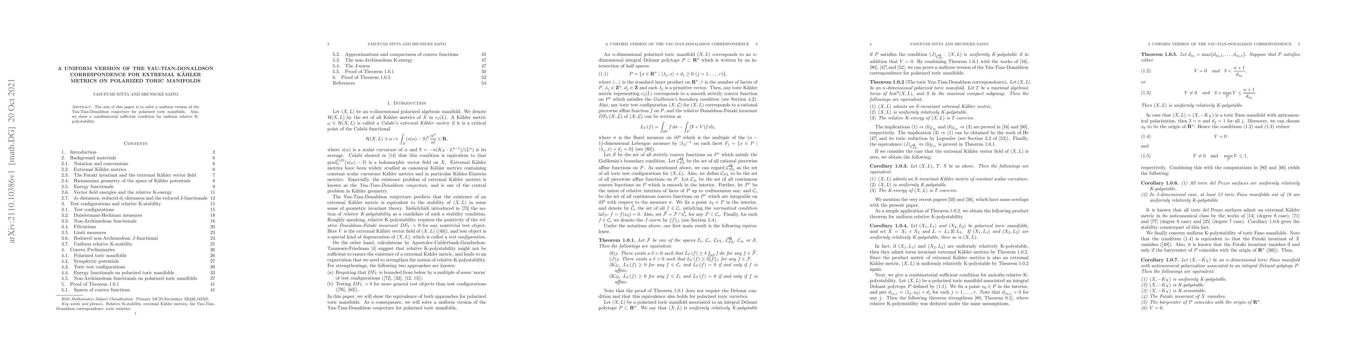 This paper resolves a uniform version of the Yau-Tian-Donaldson conjecture for extremal Kähler metrics on polarized toric manifolds and provides a combinatorial condition for uniform relative K-polystability.