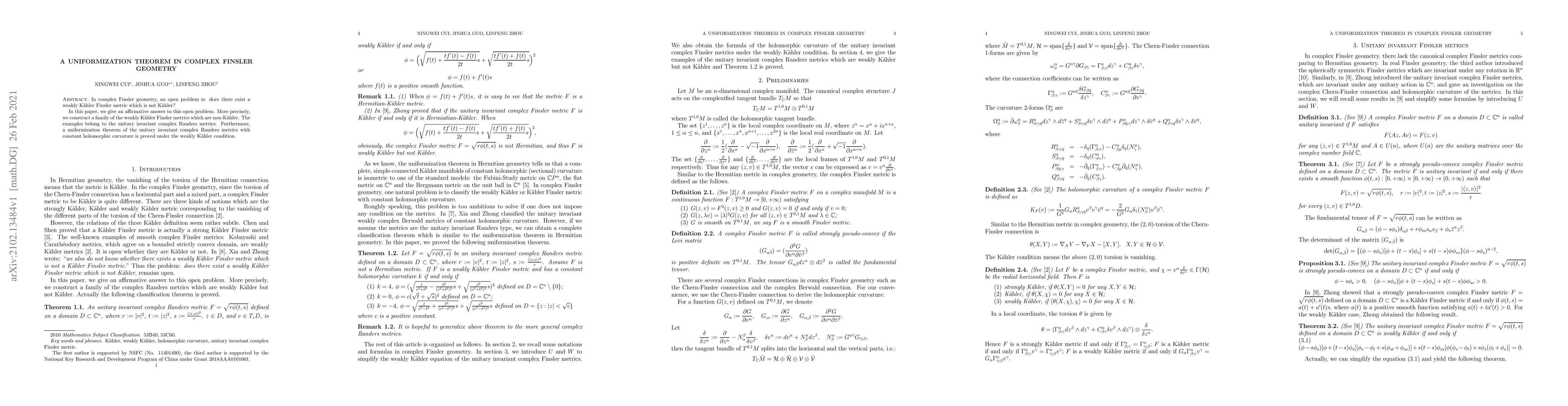 This paper constructs a family of non-Kähler weakly Kähler Finsler metrics, specifically unitary invariant complex Randers metrics, addressing an open problem in complex Finsler geometry. Additionally, it proves a uniformization theorem for these metrics under the weakly Kähler condition with constant holomorphic curvature.